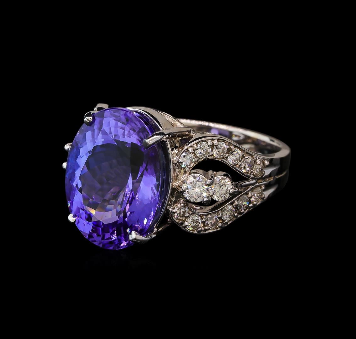 One electronically tested 14KT white gold lady's cast fashion ring with a split shank with a bright polish finish. The featured lady's ring has a shank measuring 3.58 millimeters wide. Identified with markings of 'K14'. Condition is new, good workmanship. Containing: One prong set oval modified brilliant cut natural tanzanite, measuring 15.38 x 12.33 x 8.34mm, (depth est.) approximate weight of 11.24ct., clarity is eye clean, medium, very slightly grayish, bluish violet color, (GIA bV 5/3), cut is good. Transmitting light with no distortion, transparent. Colored gemstones are presumed to have been subjected to commonly used enhancement processes. Graded in the setting. Two prong set round brilliant cut diamonds, measuring 3.00 - 2.95 x 1.85mm (depth est.) approximate total weight of 2 Stones = 0.20ct. Graded in the setting. Clarity SI-1 to SI-2. Color: H - I Cut Good Two prong set round brilliant cut diamonds, measuring 2.55 - 2.50 x 1.54mm (depth est.) approximate total weight of 2 Stones = 0.12ct. Graded in the setting. Clarity SI-1 to SI-2. Color: H - I Cut Good Twenty-Four prong set round brilliant cut diamonds, measuring 1.90 - 1.80 x 1.15mm (depth est.) approximate total weight of 24 Stones = 0.58ct. Graded in the setting. Clarity SI-1 to I-1. Color: H - I Cut Good. Total Weight of Colored Stones 11.24ct.. Total Weight of Diamonds 0.90ct.. Total Weight of Ring 9.90gm GAS Appraised at $17,835.00.