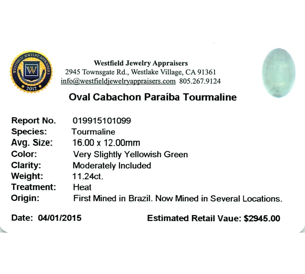 One oval cabochon cut natural Paraiba tourmaline exact weight 11.24ct., clarity is moderately included, cut is good. Westfield Appraised at $2,945.00.