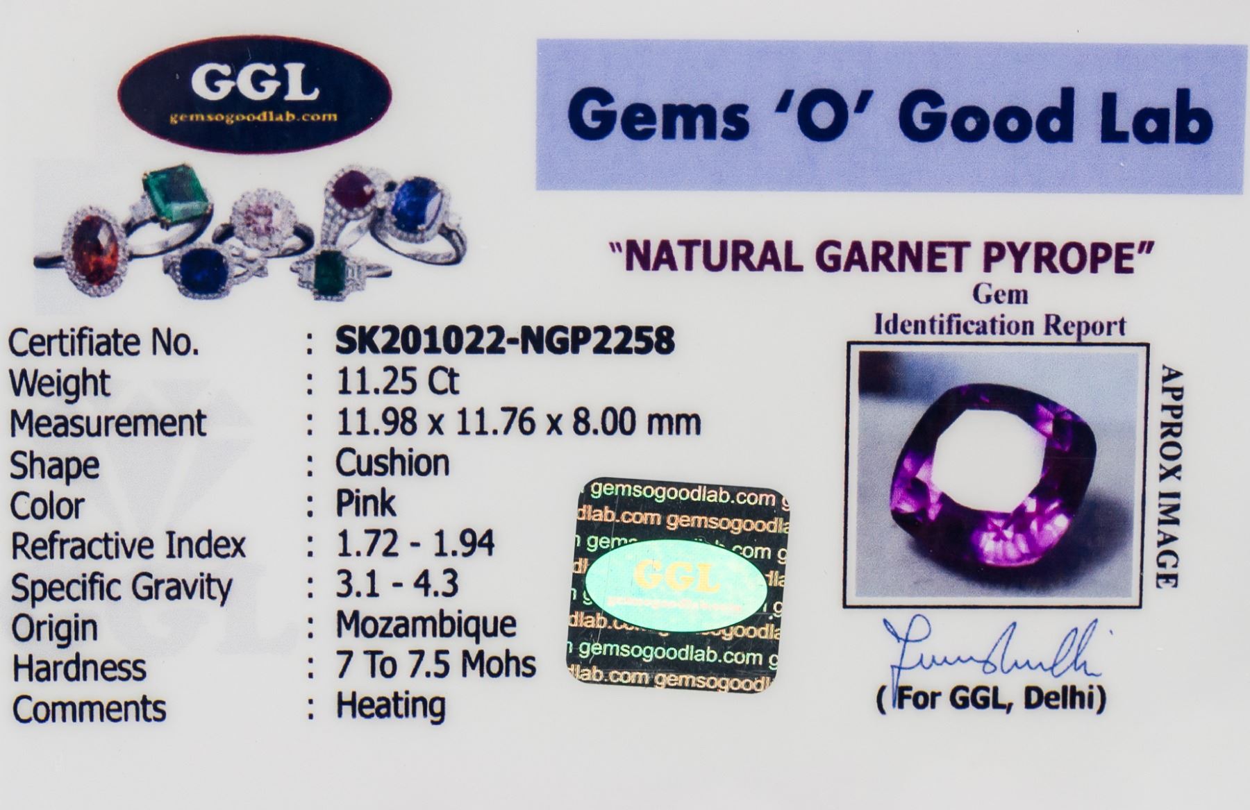 One (1) 11.25 ct cusion cut natural garnet pyrope. Origin: Mozambique. Accompanied with GGL certificate. 11.98 x 11.76 x 8.00 mm.