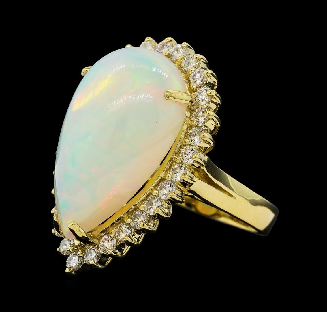 One electronically tested 14KT yellow gold lady's cast fashion ring with a basket halo with a bright polish finish. The featured lady's ring has a shank measuring 2.89 millimeters wide. Identified with markings of 'K14'. Condition is new, good workmanship. Containing: One crystal opal that is cut in a pear shaped cabochon and is prong set, measuring 23.10 mm long x 14.15 mm wide, and 9.51 mm thick and the approximate weight is 11.26 carats. The opal has a bright, multicolor play of color (fire) in a rolling flashfire pattern; a medium dome; a good cut; no inclusions; consistent in its brightness and pattern; and is not directional. Graded in the setting. Twenty-Nine prong set round brilliant cut diamonds, measuring 2.20 - 2.15 x 1.35mm (depth est.) approximate total weight of 29 Stones = 1.16ct. Graded in the setting. Clarity SI-1 to I-1. Color: G - H Cut Good. Total Weight of Diamonds 1.16ct.. Total Weight of Opals 11.26ct.. Total Weight of Ring 10.50gm. GAS Appraised at $8,195.00.