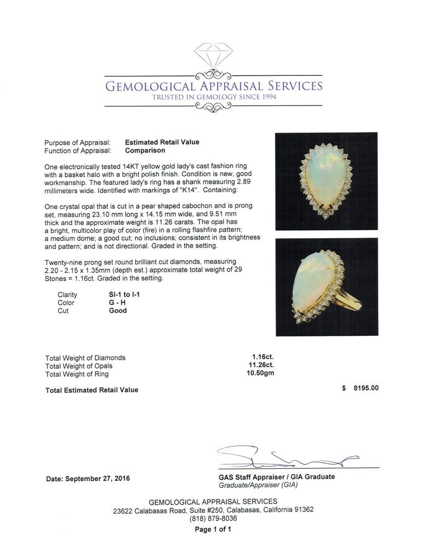 One electronically tested 14KT yellow gold lady's cast fashion ring with a basket halo with a bright polish finish. The featured lady's ring has a shank measuring 2.89 millimeters wide. Identified with markings of 'K14'. Condition is new, good workmanship. Containing: One crystal opal that is cut in a pear shaped cabochon and is prong set, measuring 23.10 mm long x 14.15 mm wide, and 9.51 mm thick and the approximate weight is 11.26 carats. The opal has a bright, multicolor play of color (fire) in a rolling flashfire pattern; a medium dome; a good cut; no inclusions; consistent in its brightness and pattern; and is not directional. Graded in the setting. Twenty-Nine prong set round brilliant cut diamonds, measuring 2.20 - 2.15 x 1.35mm (depth est.) approximate total weight of 29 Stones = 1.16ct. Graded in the setting. Clarity SI-1 to I-1. Color: G - H Cut Good. Total Weight of Diamonds 1.16ct.. Total Weight of Opals 11.26ct.. Total Weight of Ring 10.50gm. GAS Appraised at $8,195.00.
