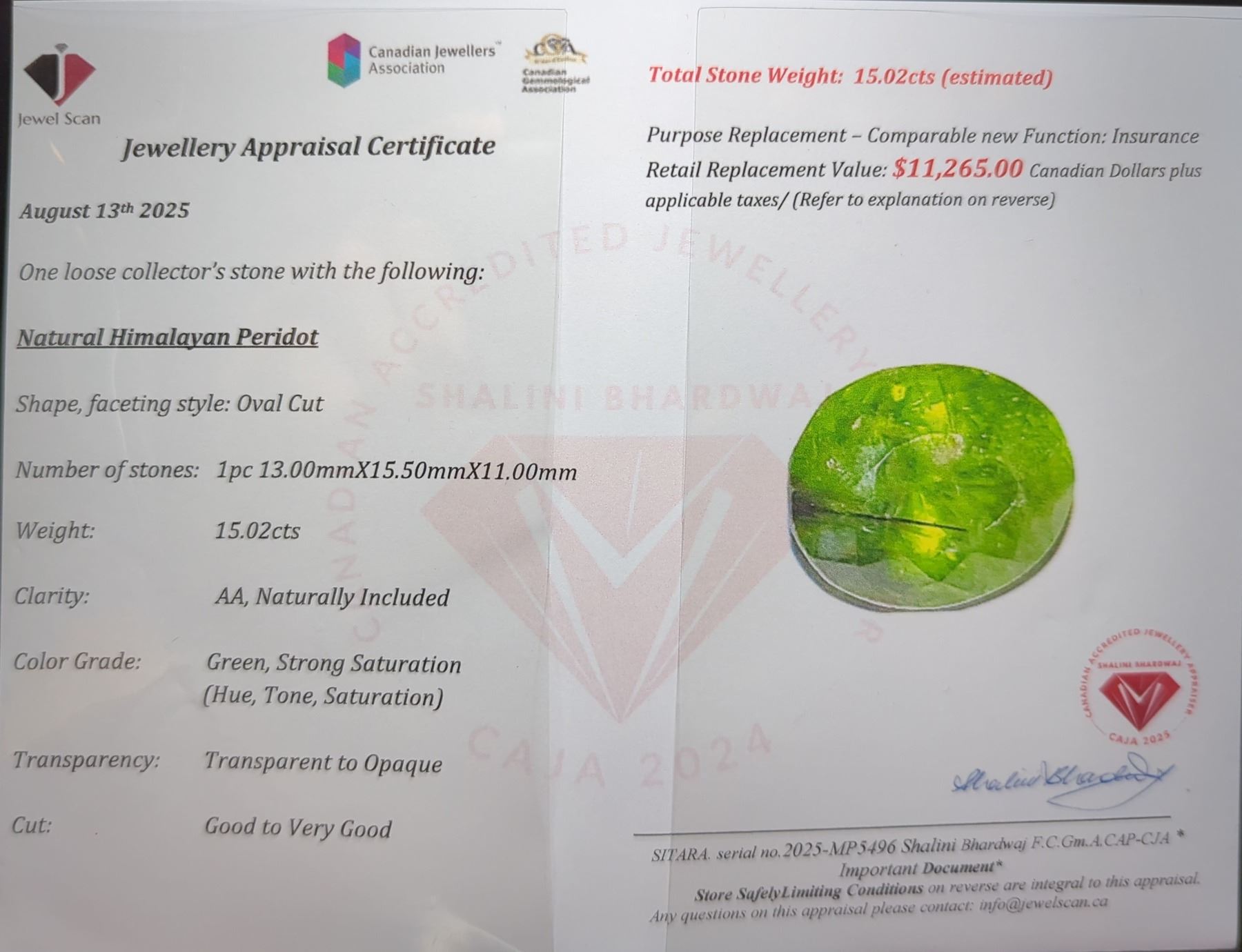 $11,265 Appraisal - 15.02 ct Cert. Himalayan Peridot gemstone