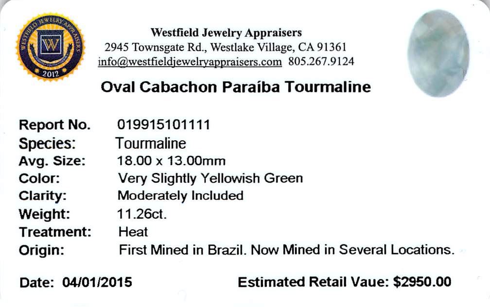 One oval cabochon cut natural Paraiba tourmaline exact weight 11.26ct., clarity is moderately included, cut is good. Westfield Appraised at $2,950.00.