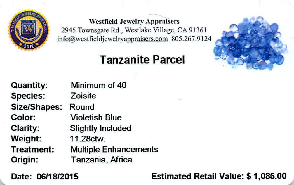 Forty round mixed cut natural tanzanites exact total weight 11.28ct., clarity is slightly included, type I, medium dark, very slightly grayish, violetish blue color, (GIA vB 6/3), cut is good. Measurements & the color grade are an average for the group, Color grade is an average for the group, Naturally occurring internal & external characteristics are present, Indications of laboratory high temperature heat treatment. Westfield Appraised at $1,085.00.