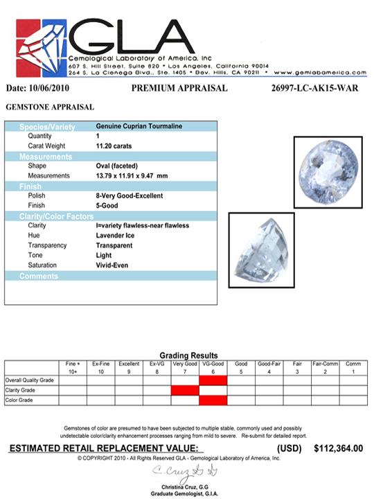 Excellent lavender ice color RARE copper-bearing specimen oval cut: COPPER in tourmaline is rare and highly prized, it makes the stone color much more vivid (sometimes neon-like) and causes the stone to mimick the reflectivity of diamond; lab quality evaluation 6; treatment as noted; Gem Guide wholesale $16800-$28000; full retail appraisal $112364; full lab evaluation included