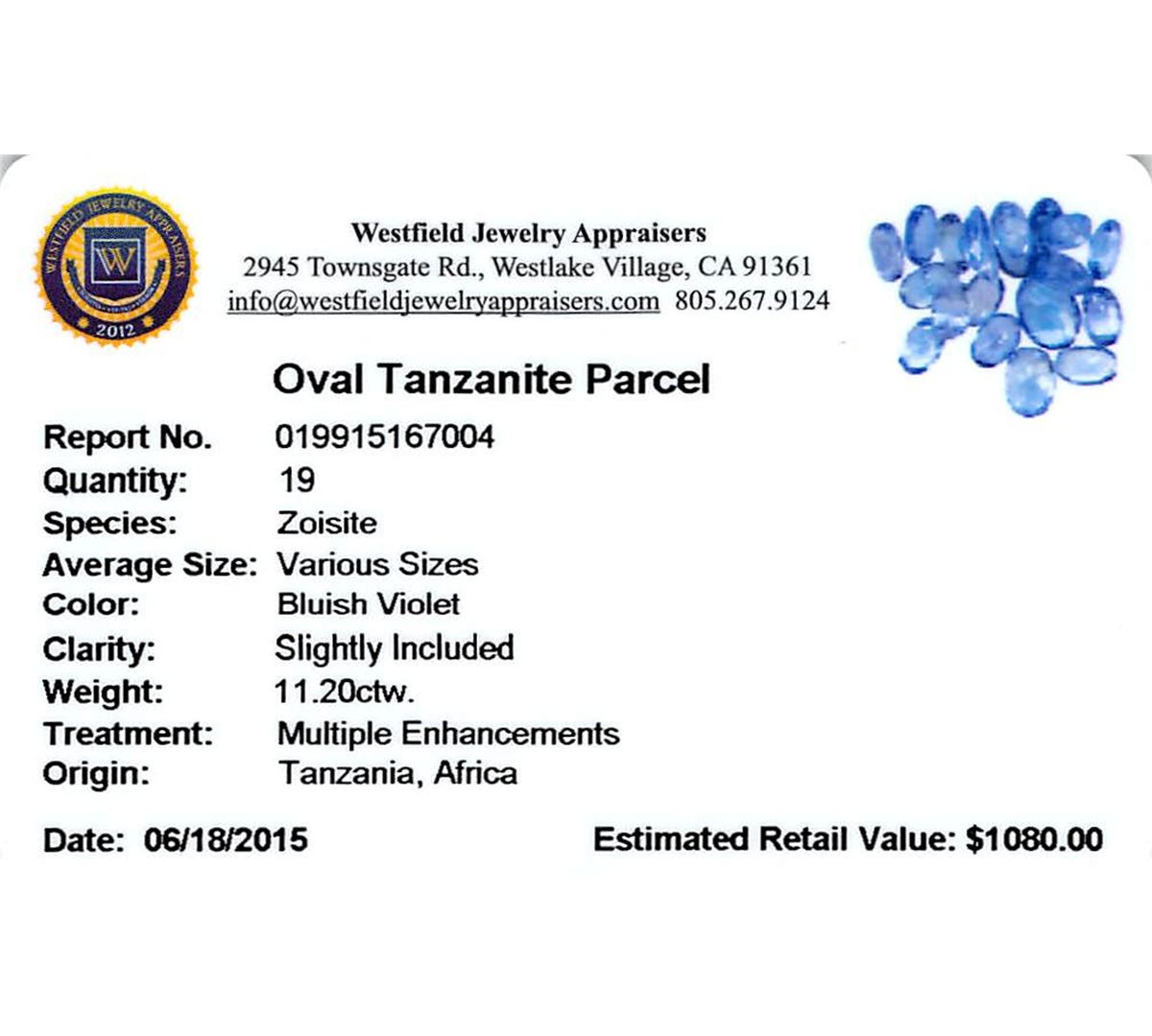 Nineteen oval mixed cut natural tanzanites exact total weight 11.20ct., clarity is slightly included, type I, medium dark, very slightly grayish, bluish violet color, (GIA bV 6/3), cut is good. Transmitting light with a minimum of distortion, transparent. Naturally occurring internal & external characteristics are present. Color grade is an average for the group. Tanzanite is a very rare gemstone that is only found in the country of Tanzania. Originally discovered in 1967. Tiffany & Company, named the stone Tanzanite. It is found in the Usumburu Mountains that border the Umba Valley of northern Tanzania. Tanzanite occurs in gray, brown, violet, blue, reddish-purple, & green. The gem is interesting because of its exceptional pleochroism. Rotated in different directions a tanzanite will exhibit multiple changes of color. Tanzanite has a low tolerance to ultrasonic cleaning, and should not be cleaned using this method. Westfield Appraised at $1,080.00.