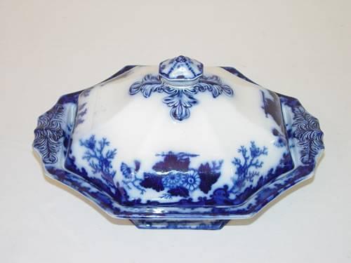 11 3/4" SCINDE FLOW BLUE COVERED VEGETABLE BY ALCOCK - FINIAL REPAIR & CHIP REPAIRS TO BASE RIM; EST. 200-300