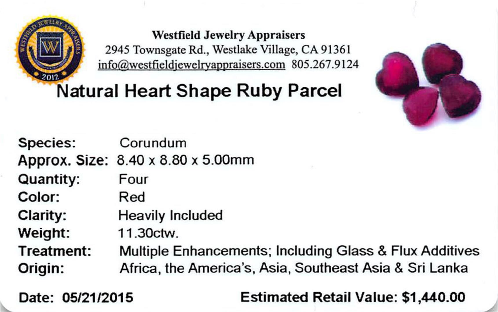 Four heart mixed cut natural rubies, measuring 8.40 x 8.80 x 5.00mm, exact total weight 11.30ct., clarity is heavily included, type II, dark, very slightly brownish, red color, (GIA R 7/3), cut is good. Measurements are an average for the group. Transmitting light somewhat diffusely, transparent to translucent. Naturally occurring internal & external characteristics are present. Indications of laboratory high temperature heat treatment, with glass & flux additives. Ruby has a low tolerance to rhodium plating, repolishing the surface, & ultrasonic cleaning. Westfield Appraised at $1,440.00.