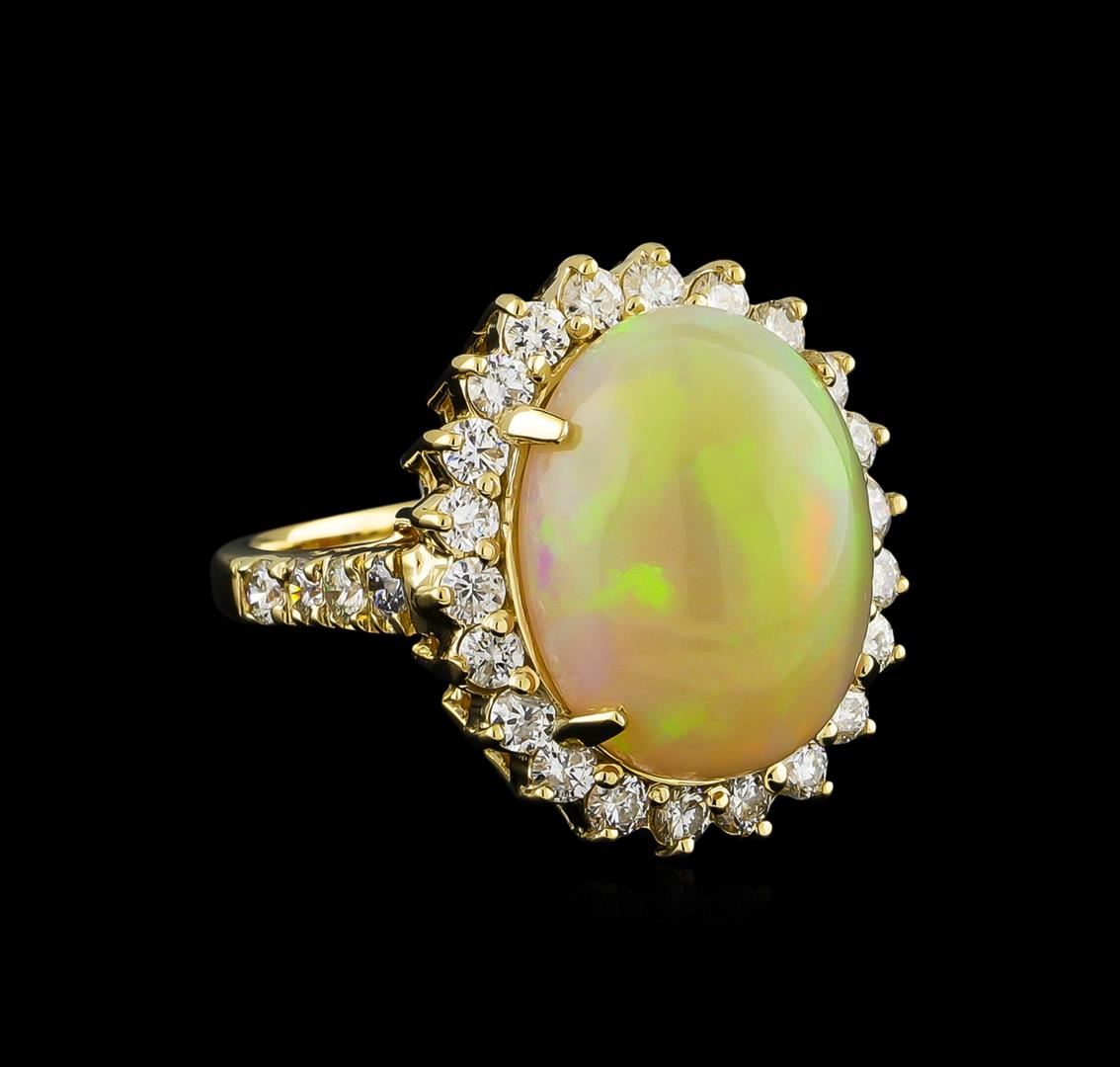 One electronically tested 14KT yellow gold ladies cast opal and diamond ring with a bright polish finish. The featured opal is set within a diamond bezel supported by diamond set shoulders, completed by a two and one-half millimeter wide band. Identified with markings of "K14". Condition is new, good workmanship. Containing: One semi crystal opal that is cut in a oval shaped cabochon and is prong set, measuring 16.70 mm long x 12.80 mm wide, and 8.40 mm thick and the approximate weight is 11.30 carats. The opal has a somewhat bright, multicolor play of color (fire) in a flashfire pattern; a high dome; a good cut; no inclusions; minor dull spot in its brightness and pattern; and is slightly directional. Graded in the setting. Thirty prong set round brilliant cut diamonds, measuring 2.30 - 2.20 x 1.35mm (depth est.) approximate. Total Weight of 30 Stones = 1.34ct. Graded in the setting. Clarity: SI-2 to I-1. Color: F - H. Total Weight of Diamonds 1.34ct. Total Weight of Opals 11.30ct. Total Weight of Ring 8.60gm. AIG Appraised at $8,430.00.