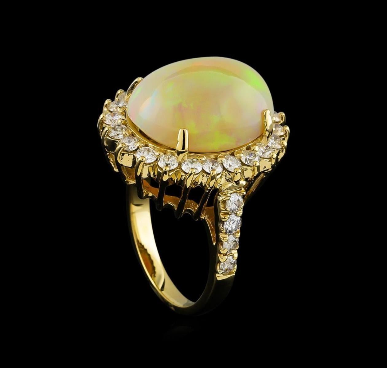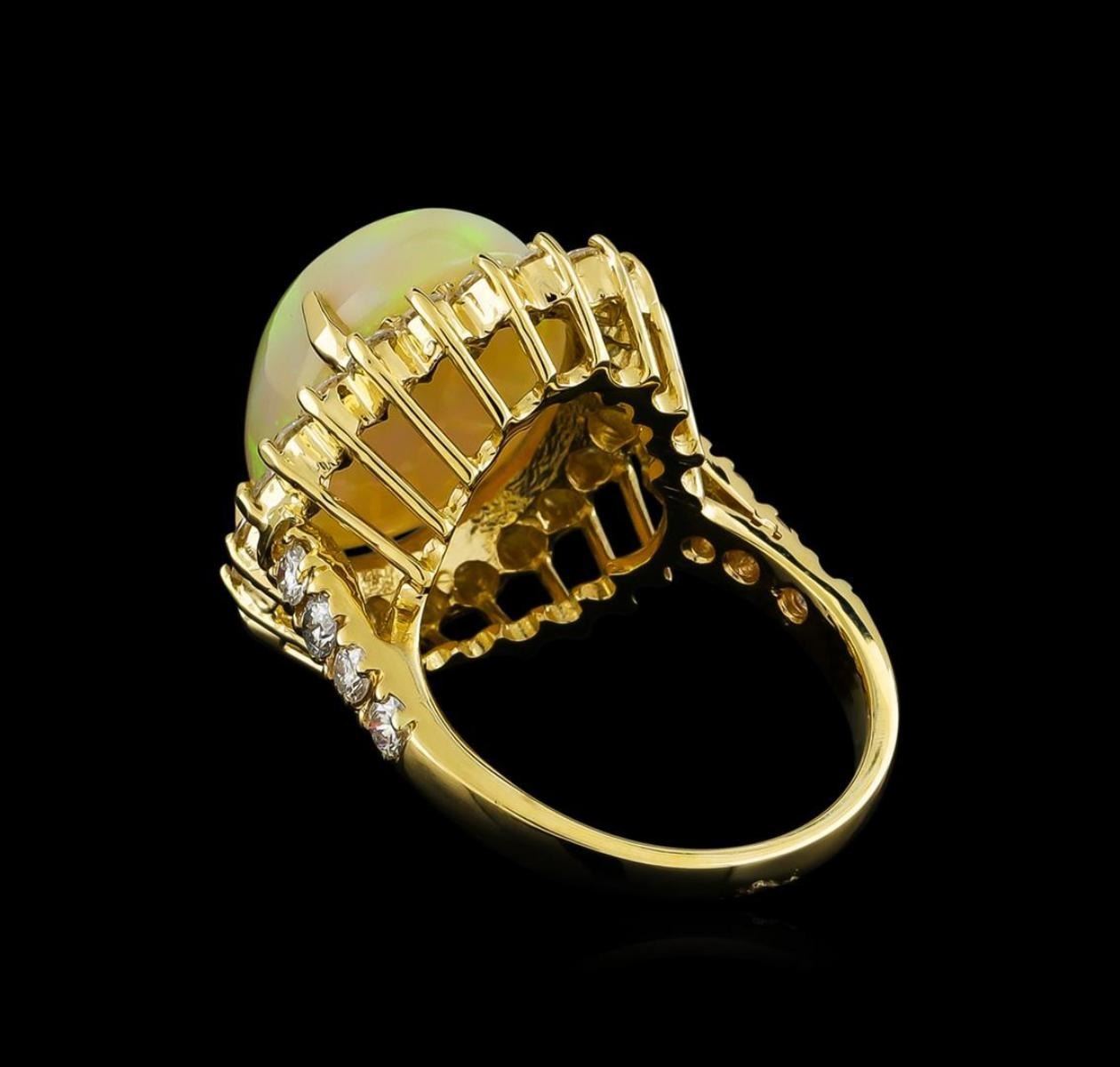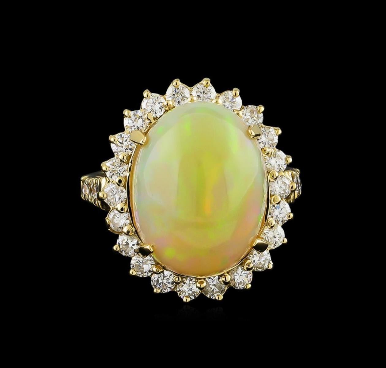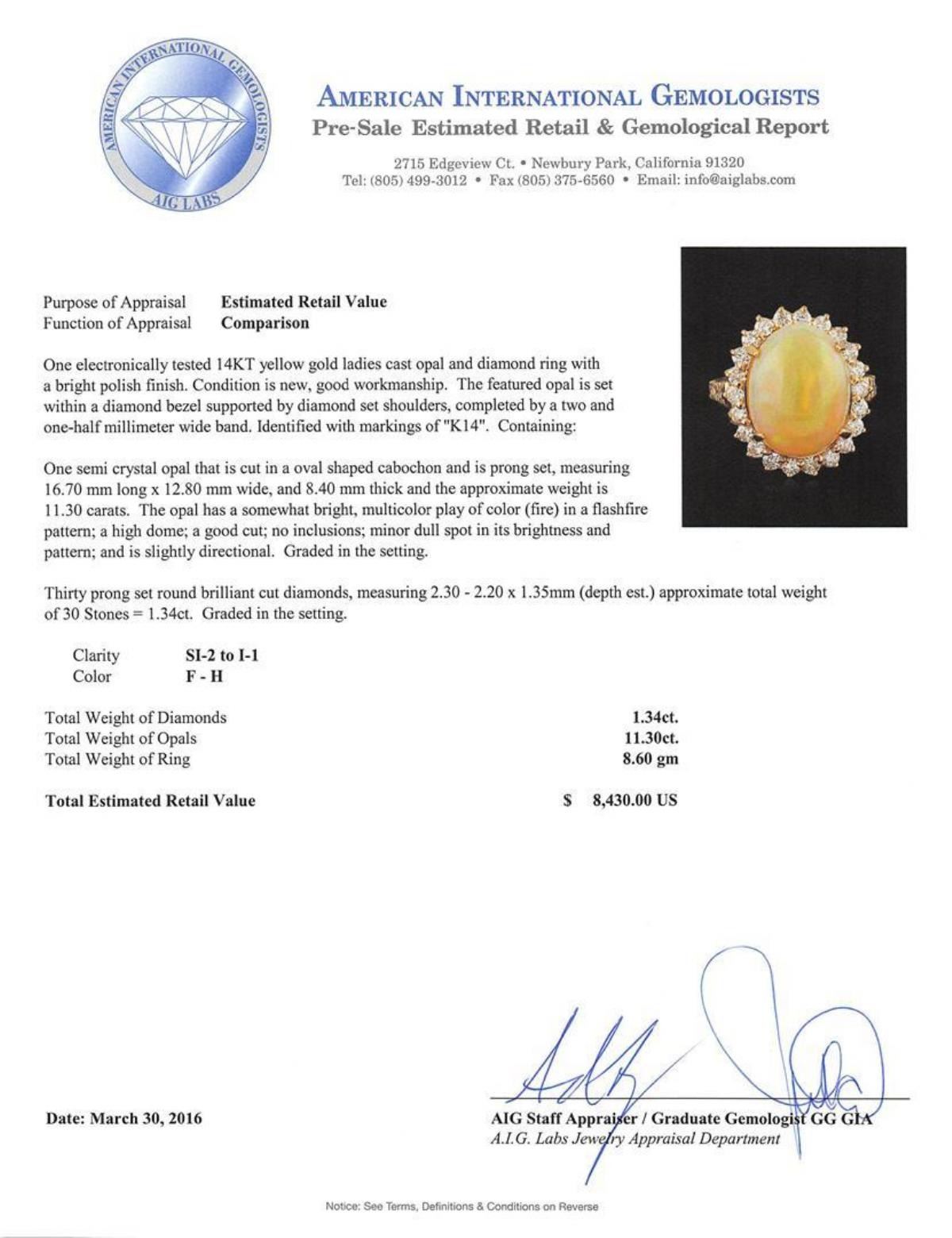 One electronically tested 14KT yellow gold ladies cast opal and diamond ring with a bright polish finish. The featured opal is set within a diamond bezel supported by diamond set shoulders, completed by a two and one-half millimeter wide band. Identified with markings of "K14". Condition is new, good workmanship. Containing: One semi crystal opal that is cut in a oval shaped cabochon and is prong set, measuring 16.70 mm long x 12.80 mm wide, and 8.40 mm thick and the approximate weight is 11.30 carats. The opal has a somewhat bright, multicolor play of color (fire) in a flashfire pattern; a high dome; a good cut; no inclusions; minor dull spot in its brightness and pattern; and is slightly directional. Graded in the setting. Thirty prong set round brilliant cut diamonds, measuring 2.30 - 2.20 x 1.35mm (depth est.) approximate. Total Weight of 30 Stones = 1.34ct. Graded in the setting. Clarity: SI-2 to I-1. Color: F - H. Total Weight of Diamonds 1.34ct. Total Weight of Opals 11.30ct. Total Weight of Ring 8.60gm. AIG Appraised.