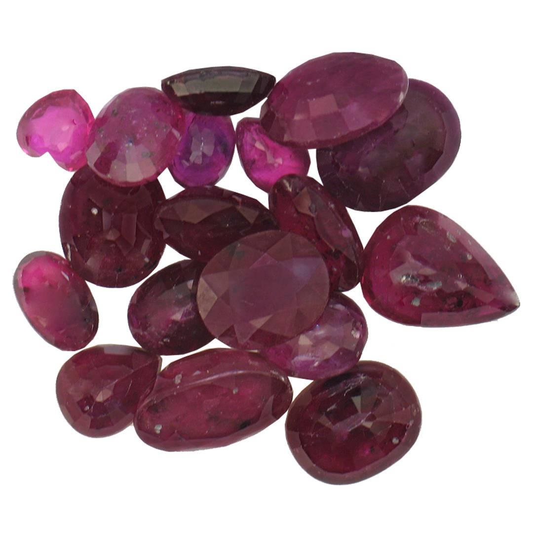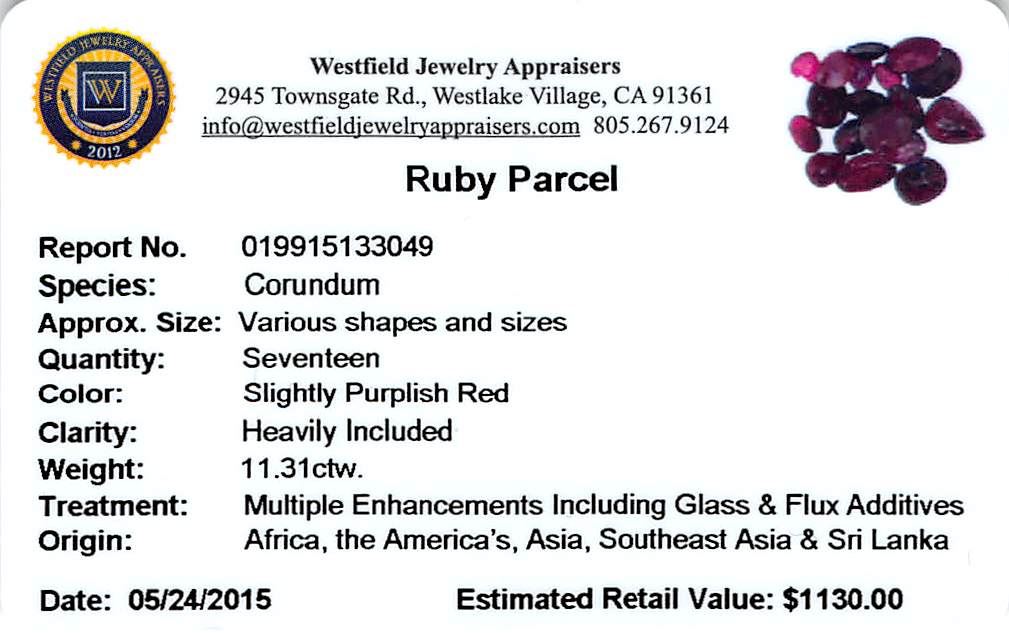 Seventeen various shapes & sizes cut natural rubies exact total weight 11.31ct., clarity is heavily included, type II, dark, very slightly brownish, slightly purplish red color, (GIA slpR 7/3), cut is good. Transmitting light somewhat diffusely, transparent to translucent. Naturally occurring internal & external characteristics are present. Indications of laboratory high temperature heat treatment, with glass & flux additives. Ruby has a low tolerance to rhodium plating, repolishing the surface, & ultrasonic cleaning. Westfield Appraised at $1,130.00.