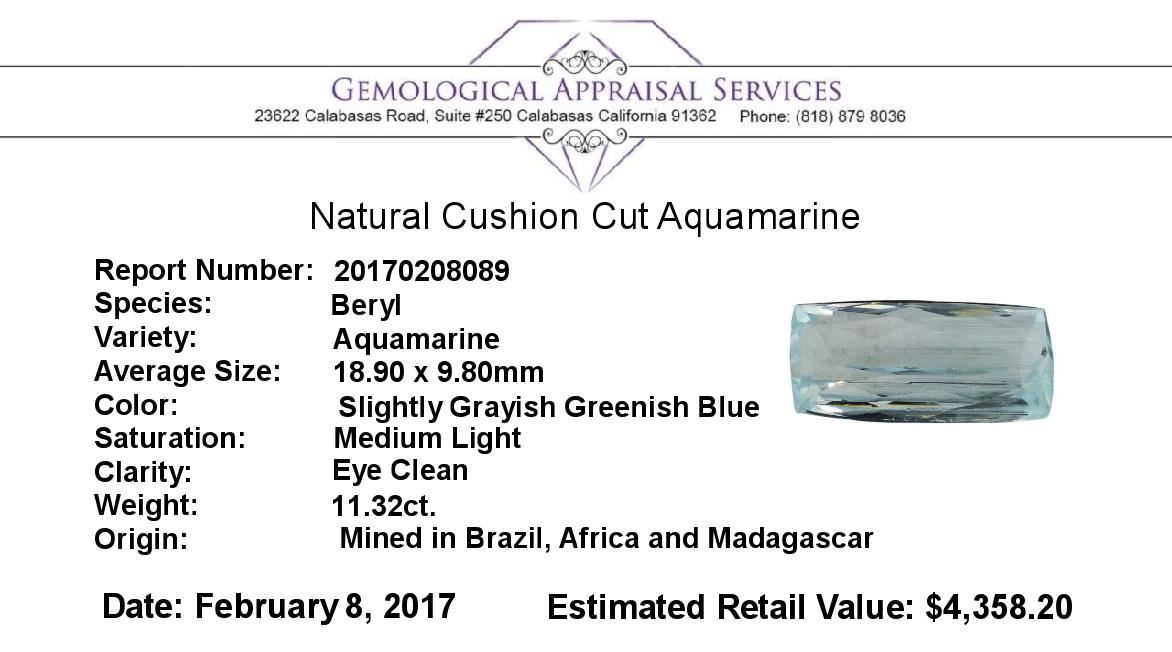 One natural cushion cut aquamarine with an exact weight of 11.32ct., clarity is eye clean, slightly grayish greenish blue, medium light. Gemological Appraisals Services estimates the retail value at $4358.2 GAS Appraised.
