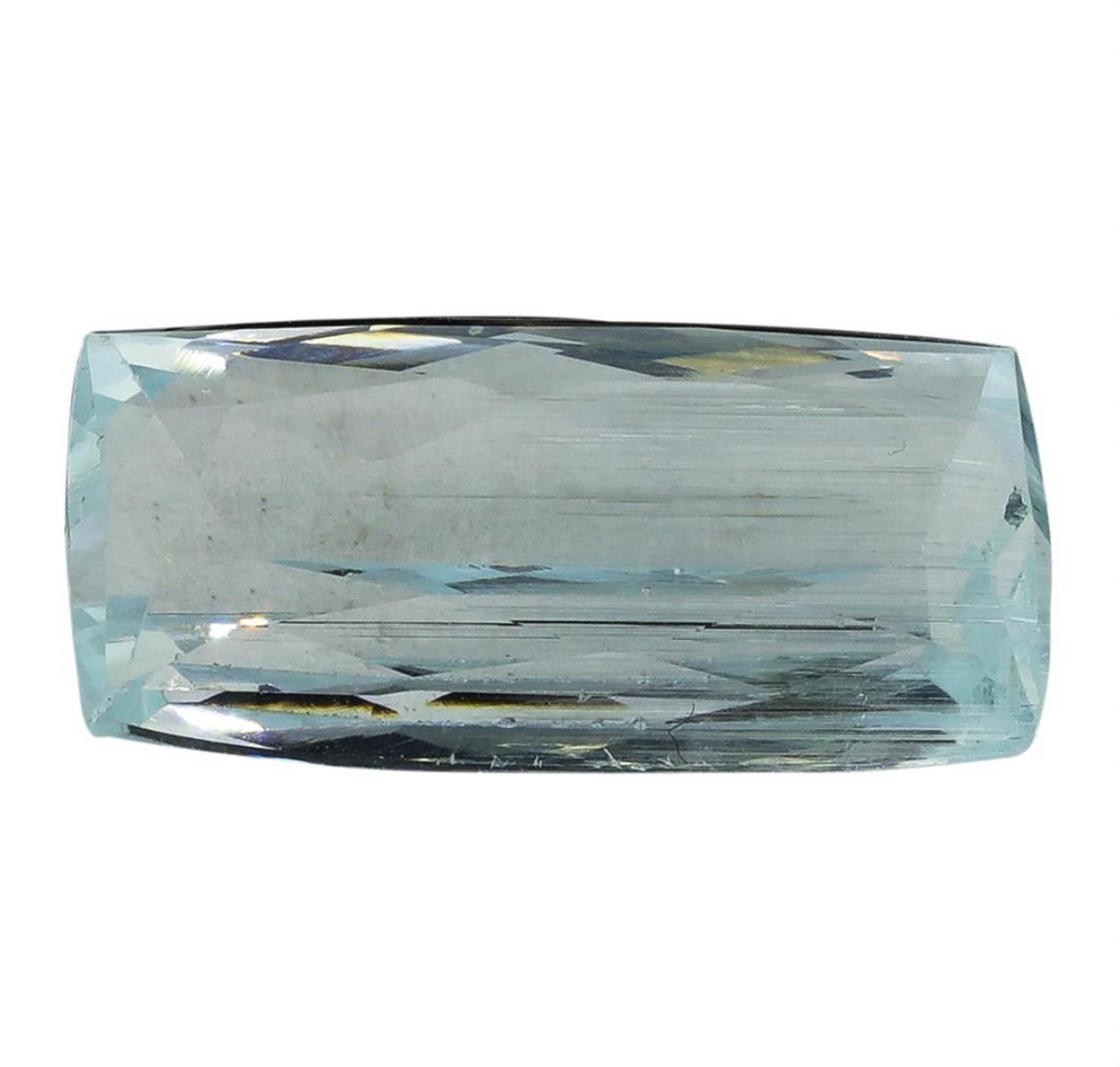 One natural cushion cut aquamarine with an exact weight of 11.32ct., clarity is eye clean, slightly grayish greenish blue, medium light. Gemological Appraisals Services estimates the retail value at $4358.2 GAS Appraised.