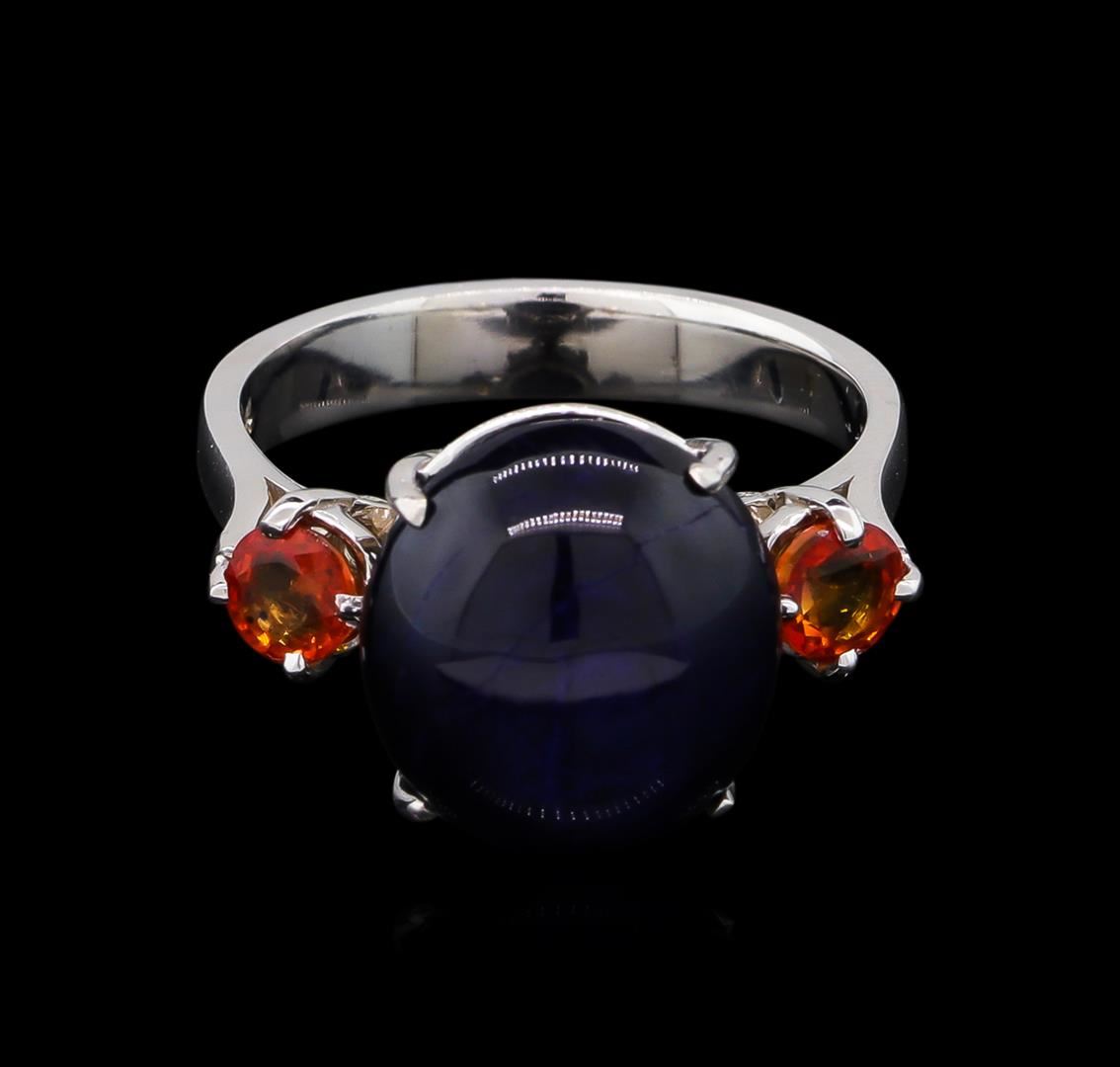 One ring featuring: 14KT white gold weighing 4.20 grams containing one blue sapphire with a total weight of 10.60ct and two orange sapphires with a total weight of 0.72ct.