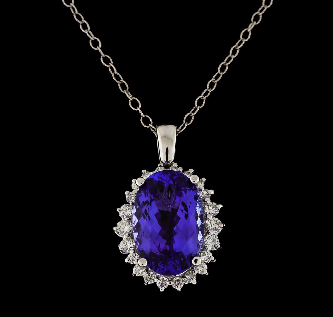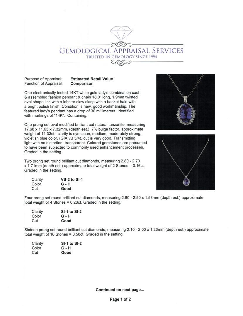 One electronically tested 14KT white gold lady's combination cast & assembled fashion pendant & chain 18.0' long, 1.9mm twisted oval shape link with a lobster claw clasp with a basket halo with a bright polish finish. The featured lady's pendant has a drop of 30 millimeters. Identified with markings of '14K'. Condition is new, good workmanship. Containing: One prong set oval modified brilliant cut natural tanzanite, measuring 17.68 x 11.63 x 7.32mm, (depth est.) 7%. bulge factor, approximate weight of 11.33ct., clarity is eye clean, medium, moderately strong, violetish blue color, (GIA vB 5/4), cut is very good. Transmitting light with no distortion, transparent. Colored gemstones are presumed to have been subjected to commonly used enhancement processes. Graded in the setting. Two prong set round brilliant cut diamonds, measuring 2.80 - 2.70 x 1.71mm (depth est.) approximate total weight of 2 Stones = 0.16ct. Graded in the setting. Clarity VS-2 to SI-1. Color: G - H Cut Good Four prong set round brilliant cut diamonds, measuring 2.60 - 2.50 x 1.58mm (depth est.) approximate total weight of 4 Stones = 0.26ct. Graded in the setting. Clarity SI-1 to SI-2. Color: G - H Cut Good Sixteen prong set round brilliant cut diamonds, measuring 2.10 - 2.00 x 1.23mm (depth est.) approximate total weight of 16 Stones = 0.50ct. Graded in the setting. Clarity SI-1 to SI-2. Color: G - H Cut Good. Total Weight of Colored Stones 11.33ct.. Total Weight of Diamonds 0.92ct.. Total Weight of Pendant & Chain 9.00gm GAS Appraised at $19,425.00.