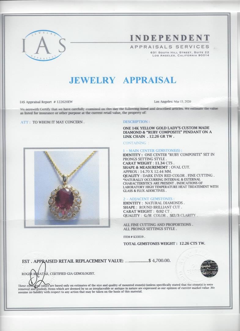 One 11.34 Ruby and Diamond Pendant With Chain - 14KT Yellow Gold. IAS certified. See Appraisal for more details.