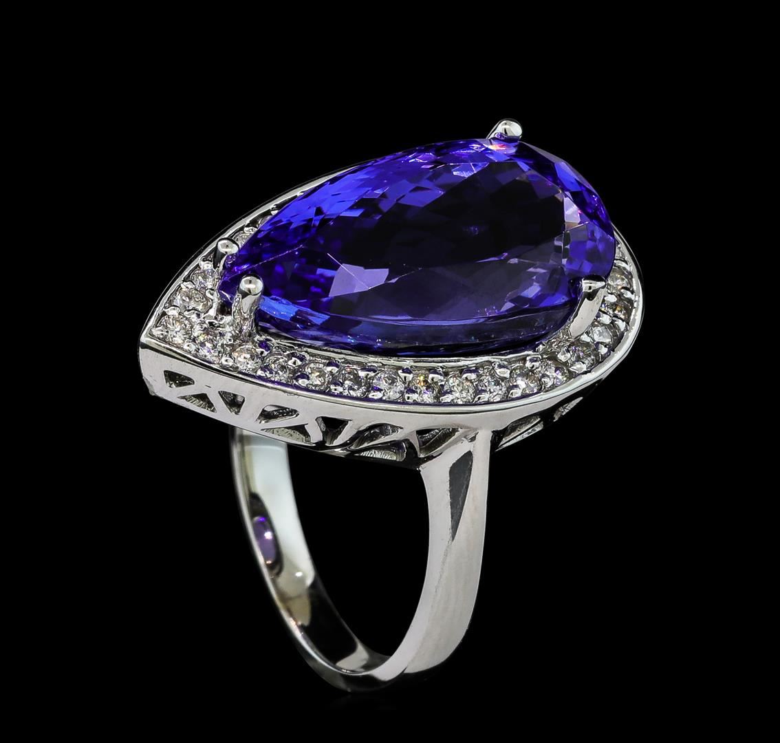 One electronically tested 14KT white gold ladies cast tanzanite and diamond ring with a bright polish finish. The featured tanzanite is set with a diamond bezel supported by a lattice under gallery, completed by a two millimeter wide band. Identified with markings of 'K14'. Condition is new, good workmanship. Containing: One prong set pear mixed cut natural tanzanite, measuring 19.30 x 9.90 x 8.20mm, 8%. bulge factor, approximate weight of 11.34ct., clarity is eye clean, type I, medium dark, very slightly grayish, bluish violet color, (GIA bV 6/3), cut is good. Transmitting light with no distortion, transparent. Colored Stone Grading Report attached. Graded in the setting. Tanzanite is a very rare gemstone that is only found in the country of Tanzania. Originally discovered in 1967. Tiffany & Company, named the stone Tanzanite. It is found in the Usumburu Mountains that border the Umba Valley of northern Tanzania. Tanzanite occurs in gray, brown, violet, blue, reddish-purple, & green. The gem is interesting because of its exceptional pleochroism. Rotated in different directions a tanzanite will exhibit multiple changes of color. Tanzanite has a low tolerance to ultrasonic cleaning, and should not be cleaned using this method. Thirty-Two prong set round brilliant cut diamonds, measuring 1.50 - 1.50 x 0.90mm (depth est.) approximate total weight of 32 Stones = 0.44ct. Graded in the setting. Clarity SI-2 to I-2. Color: G - H. Total Weight of Colored Stones 11.34ct.. Total Weight of Diamonds 0.44ct.. Total Weight of Ring 9.21gm. AIG Appraised at $28,190.00.