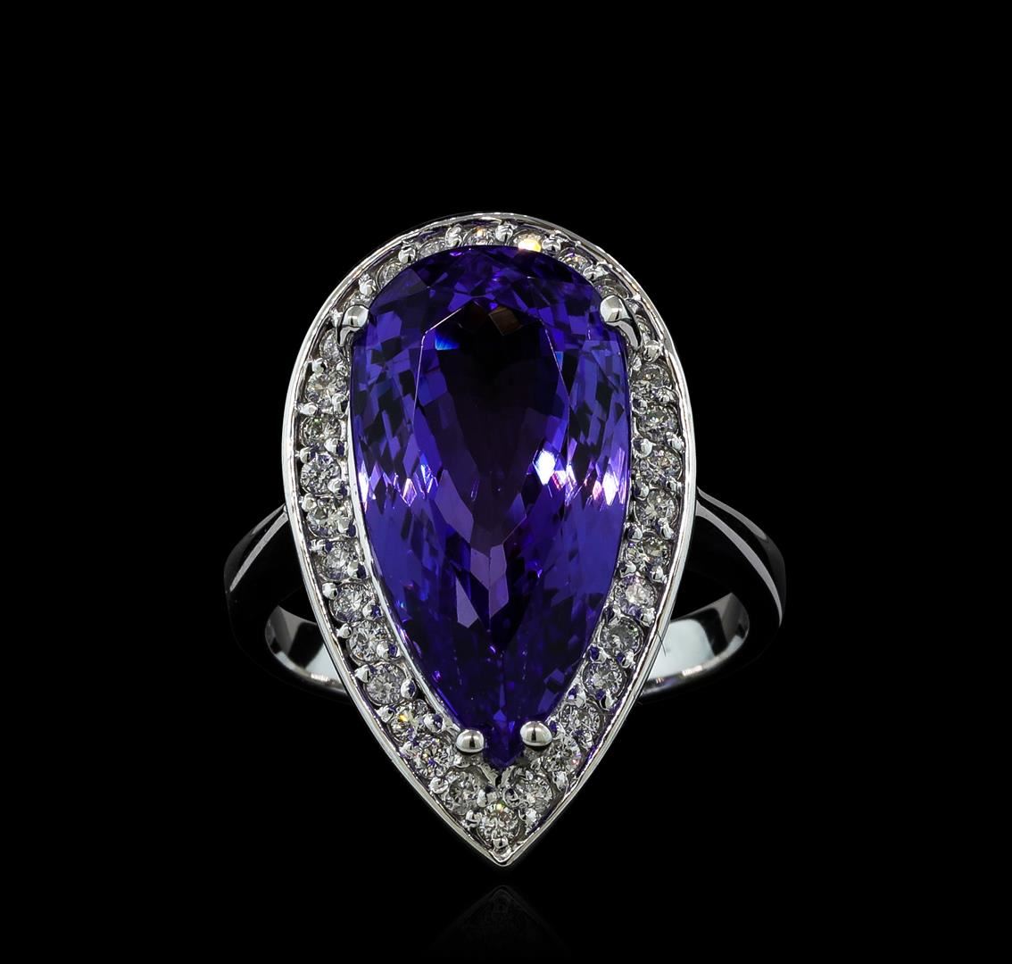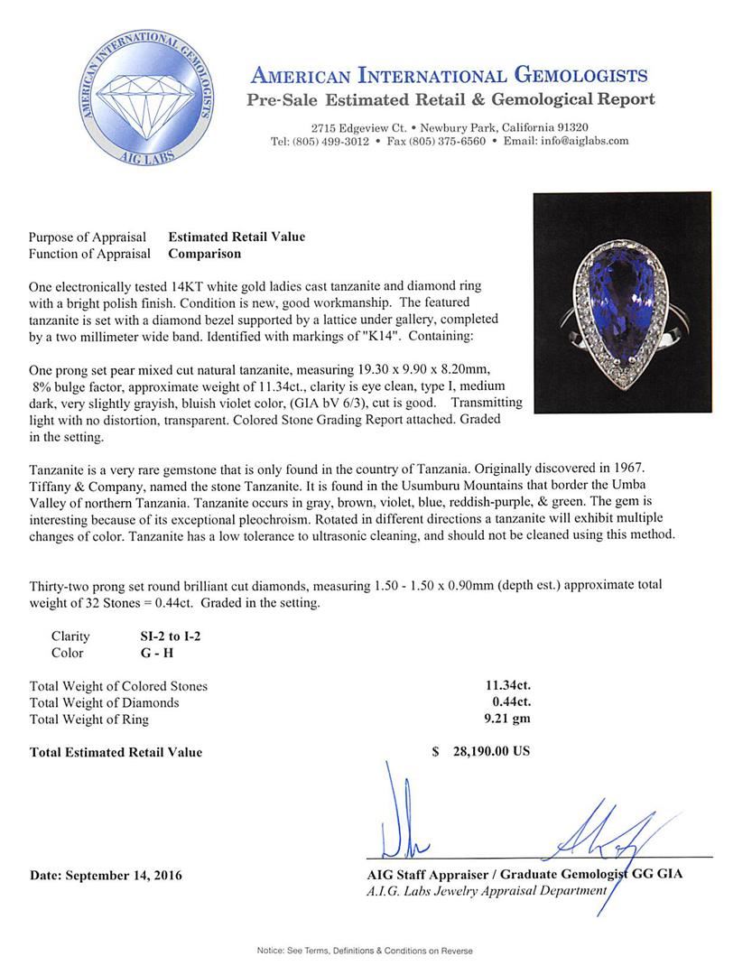 One electronically tested 14KT white gold ladies cast tanzanite and diamond ring with a bright polish finish. The featured tanzanite is set with a diamond bezel supported by a lattice under gallery, completed by a two millimeter wide band. Identified with markings of 'K14'. Condition is new, good workmanship. Containing: One prong set pear mixed cut natural tanzanite, measuring 19.30 x 9.90 x 8.20mm, 8%. bulge factor, approximate weight of 11.34ct., clarity is eye clean, type I, medium dark, very slightly grayish, bluish violet color, (GIA bV 6/3), cut is good. Transmitting light with no distortion, transparent. Colored Stone Grading Report attached. Graded in the setting. Tanzanite is a very rare gemstone that is only found in the country of Tanzania. Originally discovered in 1967. Tiffany & Company, named the stone Tanzanite. It is found in the Usumburu Mountains that border the Umba Valley of northern Tanzania. Tanzanite occurs in gray, brown, violet, blue, reddish-purple, & green. The gem is interesting because of its exceptional pleochroism. Rotated in different directions a tanzanite will exhibit multiple changes of color. Tanzanite has a low tolerance to ultrasonic cleaning, and should not be cleaned using this method. Thirty-Two prong set round brilliant cut diamonds, measuring 1.50 - 1.50 x 0.90mm (depth est.) approximate total weight of 32 Stones = 0.44ct. Graded in the setting. Clarity SI-2 to I-2. Color: G - H. Total Weight of Colored Stones 11.34ct.. Total Weight of Diamonds 0.44ct.. Total Weight of Ring 9.21gm. AIG Appraised at $28,190.00.