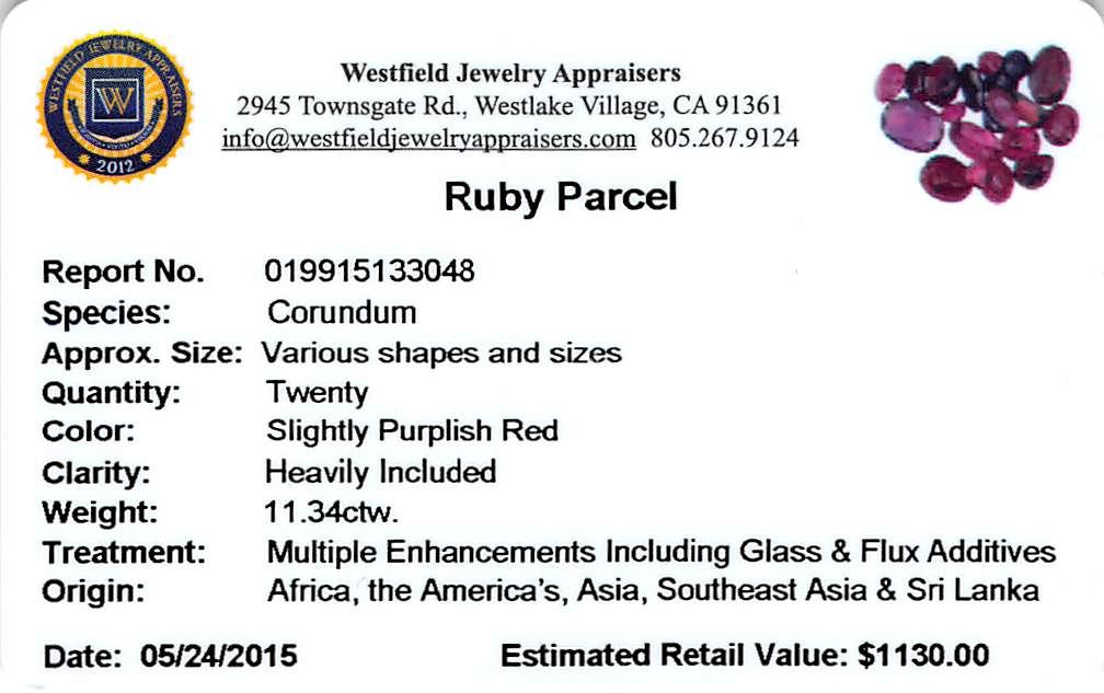 Twenty various shapes & sizes cut natural rubies exact total weight 11.34ct., clarity is heavily included, type II, dark, very slightly brownish, slightly purplish red color, (GIA slpR 7/3), cut is good. Transmitting light somewhat diffusely, transparent to translucent. Naturally occurring internal & external characteristics are present. Indications of laboratory high temperature heat treatment, with glass & flux additives. Ruby has a low tolerance to rhodium plating, repolishing the surface, & ultrasonic cleaning. Westfield Appraised at $1,130.00.