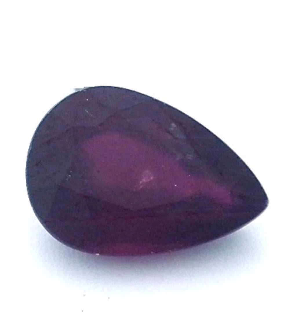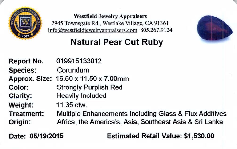 One pear mixed cut natural ruby, measuring 16.50 x 11.50 x 7.00mm, exact weight 11.35ct., clarity is heavily included, type II, dark, very slightly brownish, strongly purplish red color, (GIA stpR 7/3), cut is good. Transmitting light somewhat diffusely, transparent to translucent. Naturally occurring internal & external characteristics are present. Indications of laboratory high temperature heat treatment, with glass & flux additives. Ruby has a low tolerance to rhodium plating, repolishing the surface, & ultrasonic cleaning. Westfield Appraised at $1,530.00.