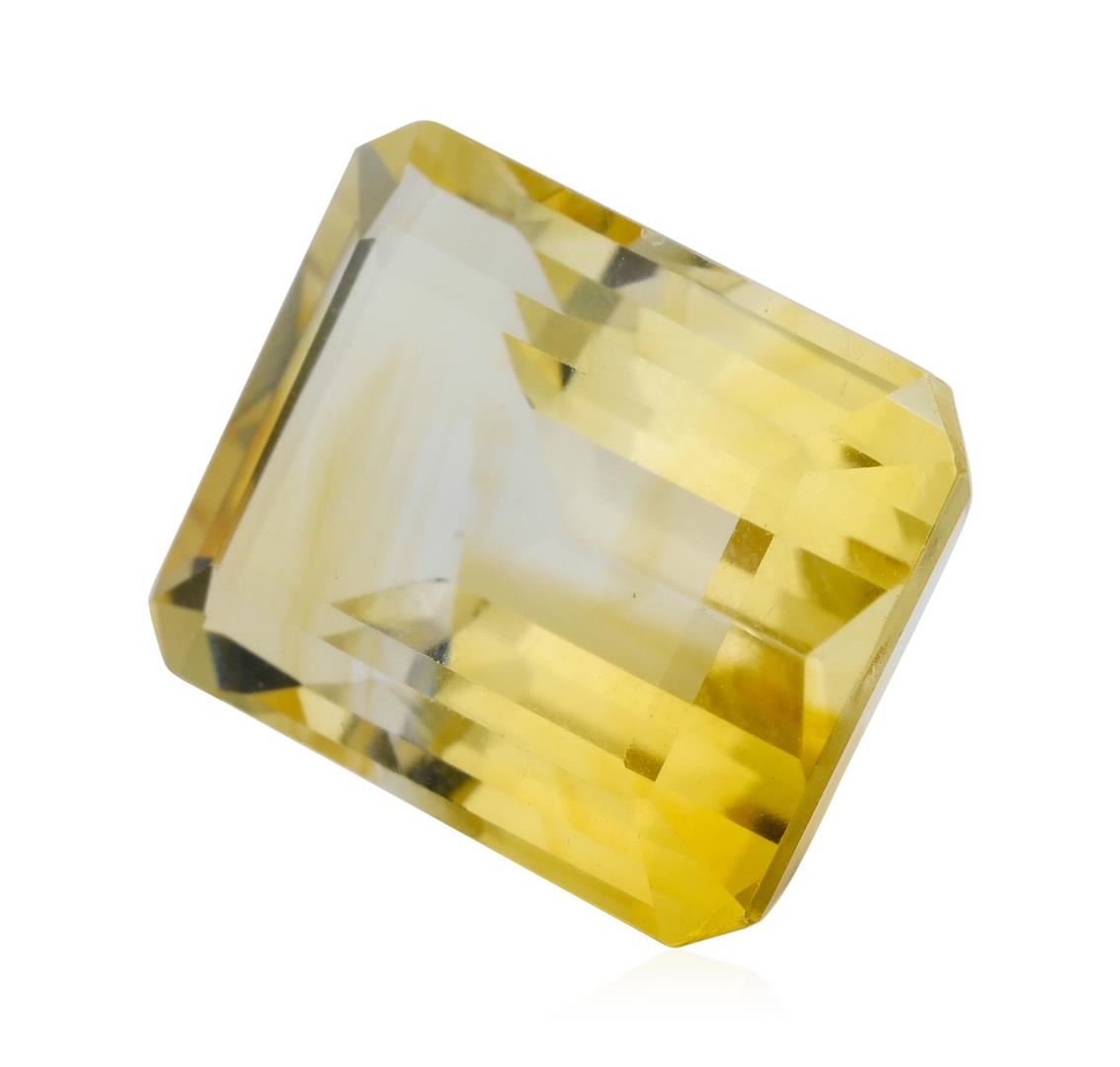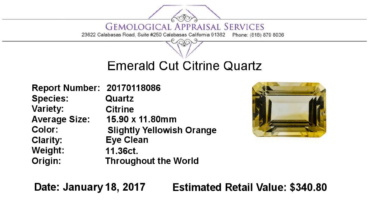 One natural emerald cut citrine quartz with an exact weight of 11.36ct., clarity is eye clean, slightly yellowish orange. Gemological Appraisals Services estimates the retail value at $340.8 GAS Appraised.
