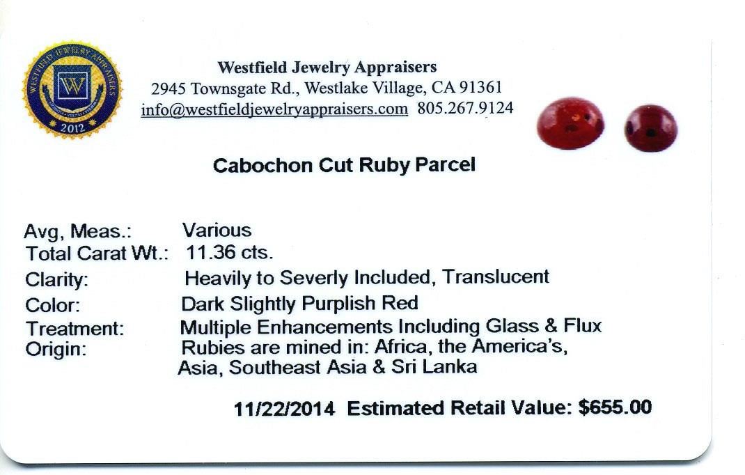 11.36ctw. Cabochon Cut Ruby Parcel. Westfield Appraised.