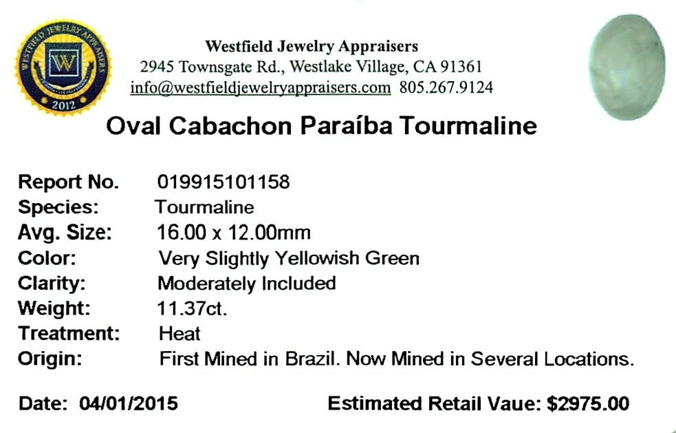 One oval cabochon cut natural Paraiba tourmaline exact weight 11.37ct., clarity is moderately included, cut is good. Westfield Appraised at $2,975.00.