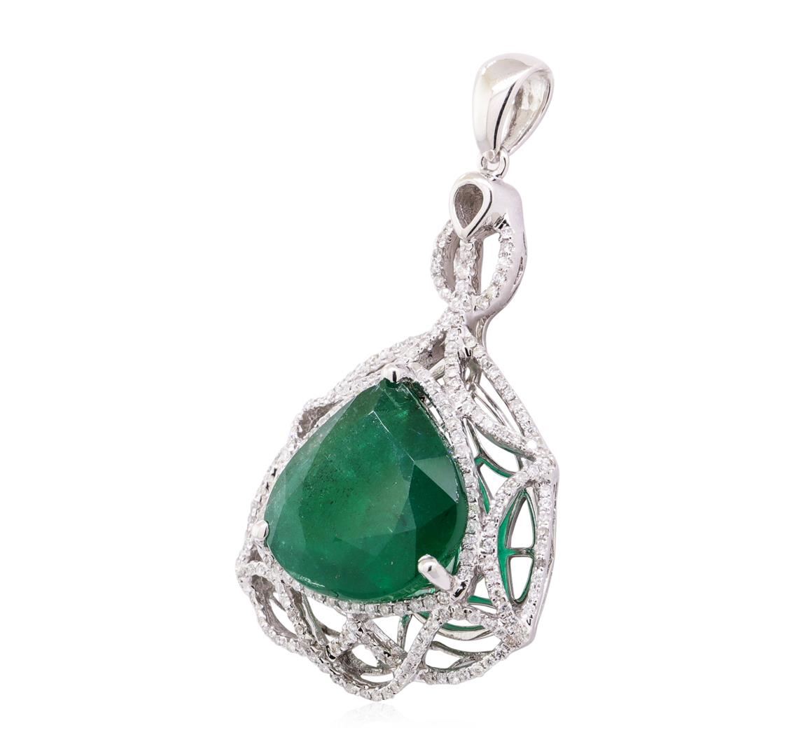 One electronically tested 14KT white gold lady's combination cast & assembled fashion pendant with a three-point halo with a bright polish finish. Trademark is Orianne. Identified with markings of '14K'. Condition is new, good workmanship. Containing: One prong set pear modified mixed cut natural emerald, measuring 15.98 x 15.05 x 7.51mm, (depth est.) 10%. bulge factor, approximate weight of 10.70ct., clarity is heavily included, medium dark, moderately strong, green color, (GIA G 6/4), cut is very good. Colored gemstones are presumed to have been subjected to commonly used enhancement processes. Indications of Clarity Enhancement (F1). Graded loose prior to setting in the GIA Laboratory, Report #2151952101. One Hundred Ninety-One prong set round brilliant cut diamonds, measuring 1.00 - 0.95 x 0.61mm (depth est.) approximate total weight of 191 Stones = 0.68ct. Graded in the setting. Color G - H Clarity SI-2 to I-2 Cut Good. Total Weight of Colored Stones 10.70ct.. Total Weight of Diamonds 0.68ct.. Total Weight of Pendant 9.60gm GAS Appraised at $18225.00. GAS Appraised at $18,225.00.