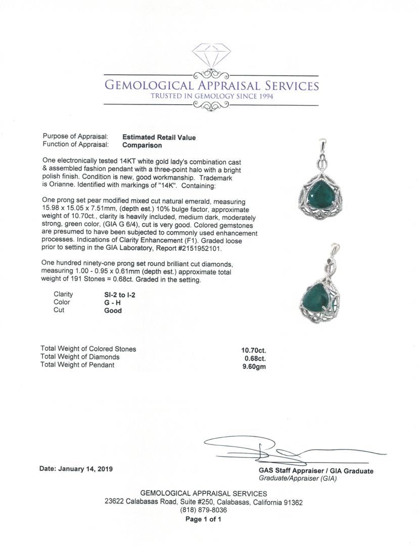 One electronically tested 14KT white gold lady's combination cast & assembled fashion pendant with a three-point halo with a bright polish finish. Trademark is Orianne. Identified with markings of '14K'. Condition is new, good workmanship. Containing: One prong set pear modified mixed cut natural emerald, measuring 15.98 x 15.05 x 7.51mm, (depth est.) 10%. bulge factor, approximate weight of 10.70ct., clarity is heavily included, medium dark, moderately strong, green color, (GIA G 6/4), cut is very good. Colored gemstones are presumed to have been subjected to commonly used enhancement processes. Indications of Clarity Enhancement (F1). Graded loose prior to setting in the GIA Laboratory, Report #2151952101. One Hundred Ninety-One prong set round brilliant cut diamonds, measuring 1.00 - 0.95 x 0.61mm (depth est.) approximate total weight of 191 Stones = 0.68ct. Graded in the setting. Color G - H Clarity SI-2 to I-2 Cut Good. Total Weight of Colored Stones 10.70ct.. Total Weight of Diamonds 0.68ct.. Total Weight of Pendant 9.60gm GAS Appraised at $18225.00. GAS Appraised at $18,225.00.
