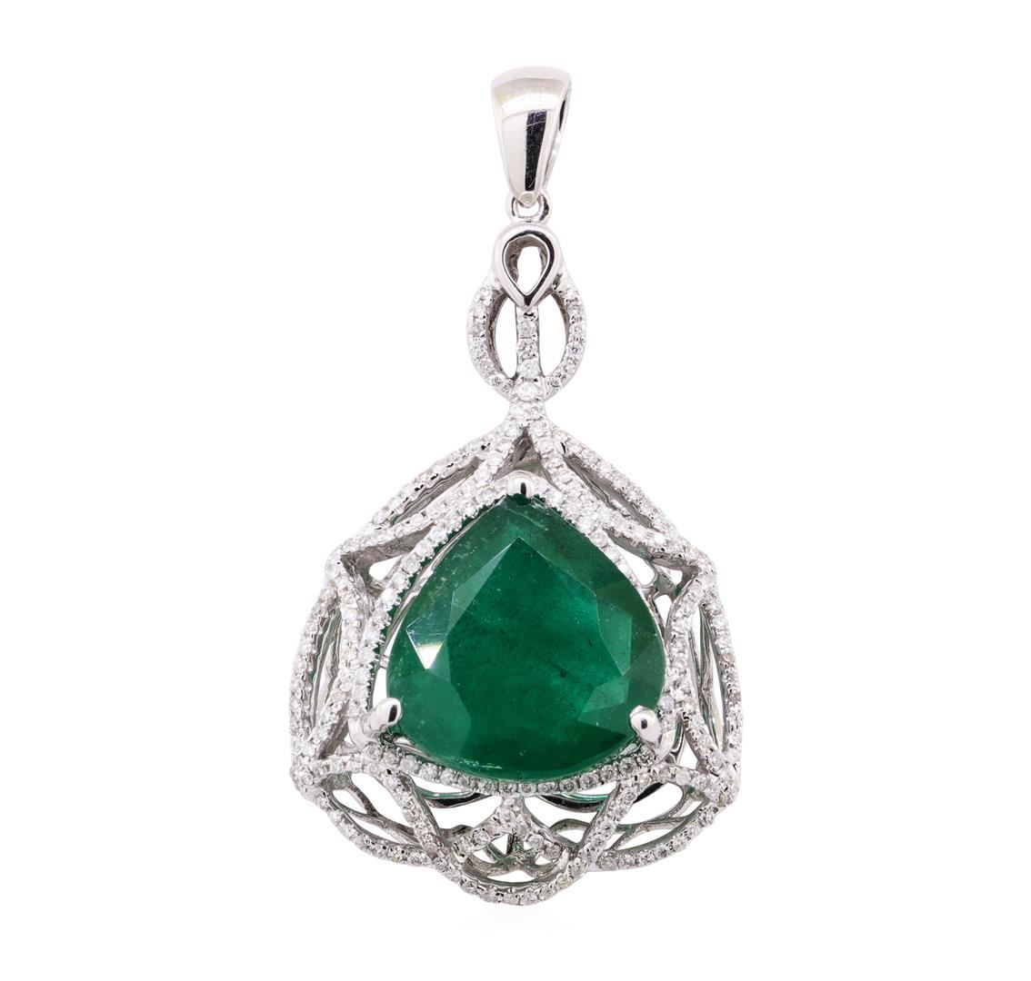 One electronically tested 14KT white gold lady's combination cast & assembled fashion pendant with a three-point halo with a bright polish finish. Trademark is Orianne. Identified with markings of '14K'. Condition is new, good workmanship. Containing: One prong set pear modified mixed cut natural emerald, measuring 15.98 x 15.05 x 7.51mm, (depth est.) 10%. bulge factor, approximate weight of 10.70ct., clarity is heavily included, medium dark, moderately strong, green color, (GIA G 6/4), cut is very good. Colored gemstones are presumed to have been subjected to commonly used enhancement processes. Indications of Clarity Enhancement (F1). Graded loose prior to setting in the GIA Laboratory, Report #2151952101. One Hundred Ninety-One prong set round brilliant cut diamonds, measuring 1.00 - 0.95 x 0.61mm (depth est.) approximate total weight of 191 Stones = 0.68ct. Graded in the setting. Color G - H Clarity SI-2 to I-2 Cut Good. Total Weight of Colored Stones 10.70ct.. Total Weight of Diamonds 0.68ct.. Total Weight of Pendant 9.60gm GAS Appraised at $18225.00. GAS Appraised at $18,225.00.