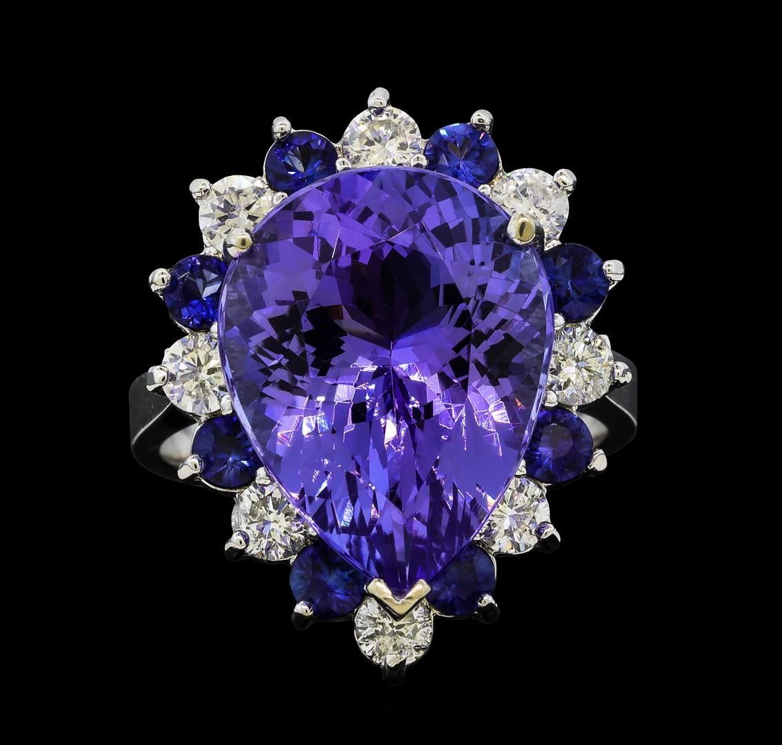 One electronically tested 14KT white gold lady's cast fashion ring with a basket halo with a bright polish finish. The featured lady's ring has a shank measuring 3.25 millimeters wide. Identified with markings of 'K14'. Condition is new, good workmanship. Containing: One prong set pear modified brilliant cut natural tanzanite, measuring 16.30 x 12.70 x 8.28mm, (depth est.) approximate weight of 10.42ct., clarity is eye clean, medium dark, very slightly grayish, bluish violet color, (GIA bV 6/3), cut is very good. Transmitting light with no distortion, transparent. Colored gemstones are presumed to have been subjected to commonly used enhancement processes. Graded in the setting. Eight prong set round modified brilliant cut natural blue sapphires, measuring 2.90 - 2.80 x 1.85 mm, (depth est.) approximate total weight of 0.96ct., clarity is eye clean, medium dark, strong, blue color, (GIA B 6/5), cut is very good. Transmitting light with no distortion, transparent. Colored gemstones are presumed to have been subjected to commonly used enhancement processes. Graded in the setting. Eight prong set round brilliant cut diamonds, measuring 3.10 - 3.05 x 1.91mm (depth est.) approximate total weight of 8 Stones = 0.88ct. Graded in the setting. Clarity SI-1 to I-1. Color: H - I Cut Good. Total Weight of Colored Stones 11.38ct.. Total Weight of Diamonds 0.88ct.. Total Weight of Ring 8.80gm. GAS Appraised at $18,185.00.