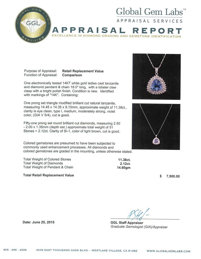One electronically tested 14KT white gold ladies cast tanzanite and diamond pendant & chain 18.0" long, with a lobster claw clasp with a bright polish finish. Identified with markings of "14K". Condition is new. Containing: One prong set triangle modified brilliant cut natural tanzanite, measuring 14.45 x 14.35 x 9.10mm, approximate weight of 11.38ct., clarity is eye clean, type I, medium, moderately strong, violet color, (GIA V 5/4), cut is good. Fifty-One prong set round brilliant cut diamonds, measuring 2.50 - 2.00 x 1.35mm (depth est.) approximate. Total Weight of 51 Stones = 2.12ct. Clarity: SI-1, Cut is Good. Colored gemstones are presumed to have been subjected to commonly used enhancement processes. All diamonds and colored gemstones are graded in the mounting, unless otherwise stated. Total Weight of Colored Stones 11.38ct. Total Weight of Diamonds 2.12ct. Total Weight of Pendant & Chain 14.60 grams. GGL Appraised at $7,900.00.