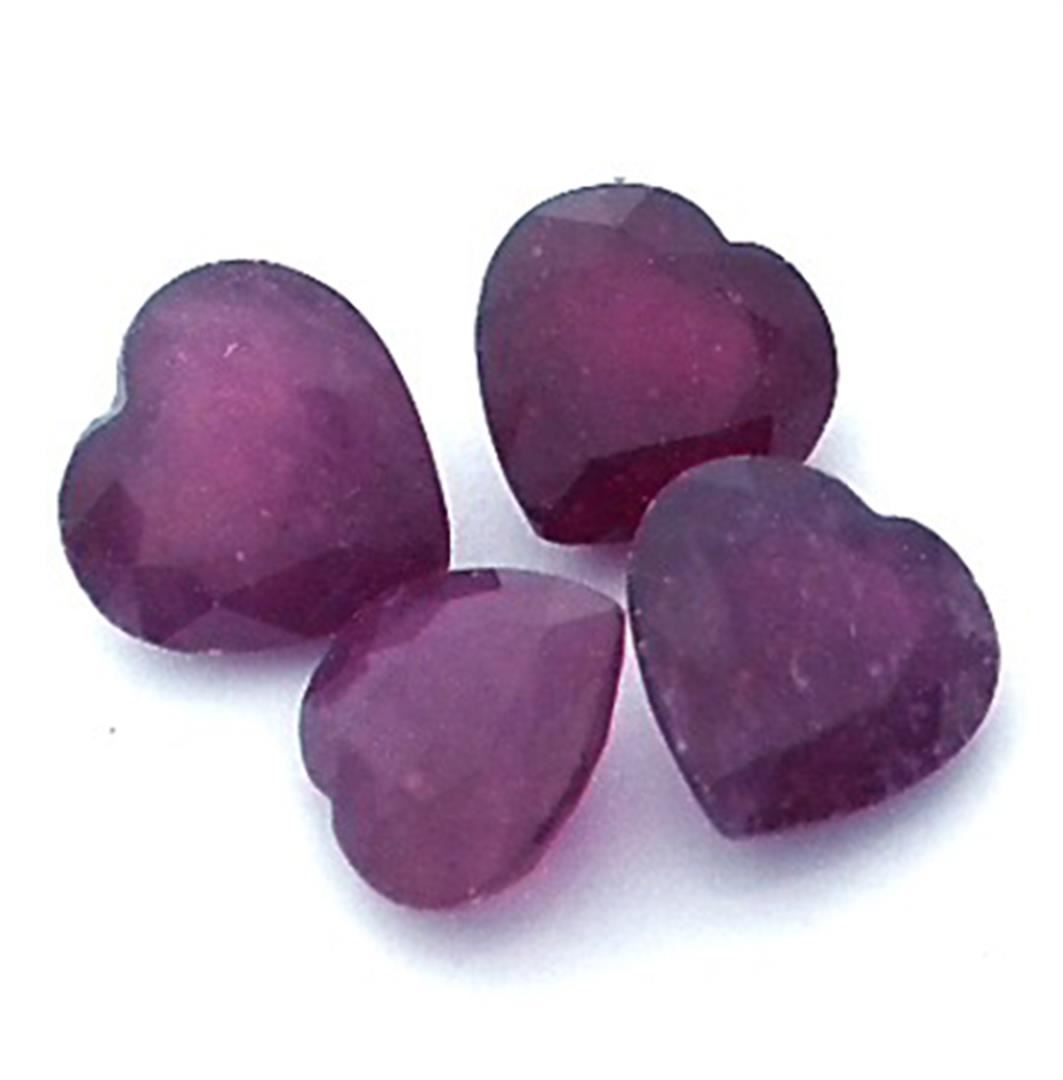 Four heart mixed cut natural rubies, measuring 8.40 x 8.80 x 5.00mm, exact total weight 11.30ct., clarity is heavily included, type II, dark, very slightly brownish, red color, (GIA R 7/3), cut is good. Measurements are an average for the group. Transmitting light somewhat diffusely, transparent to translucent. Naturally occurring internal & external characteristics are present. Indications of laboratory high temperature heat treatment, with glass & flux additives. Ruby has a low tolerance to rhodium plating, repolishing the surface, & ultrasonic cleaning. Westfield Appraised at $1,440.00.