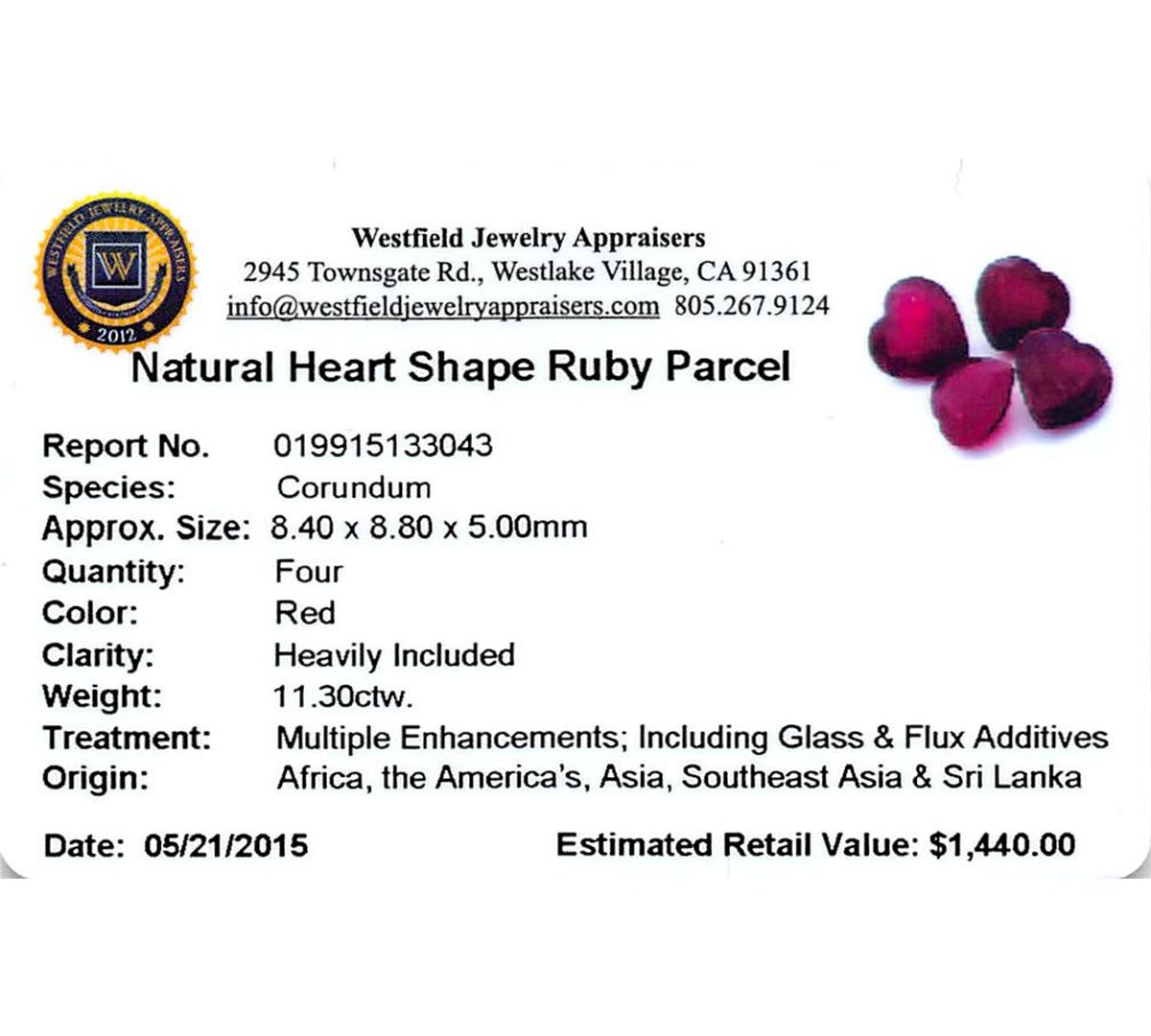 Four heart mixed cut natural rubies, measuring 8.40 x 8.80 x 5.00mm, exact total weight 11.30ct., clarity is heavily included, type II, dark, very slightly brownish, red color, (GIA R 7/3), cut is good. Measurements are an average for the group. Transmitting light somewhat diffusely, transparent to translucent. Naturally occurring internal & external characteristics are present. Indications of laboratory high temperature heat treatment, with glass & flux additives. Ruby has a low tolerance to rhodium plating, repolishing the surface, & ultrasonic cleaning. Westfield Appraised at $1,440.00.