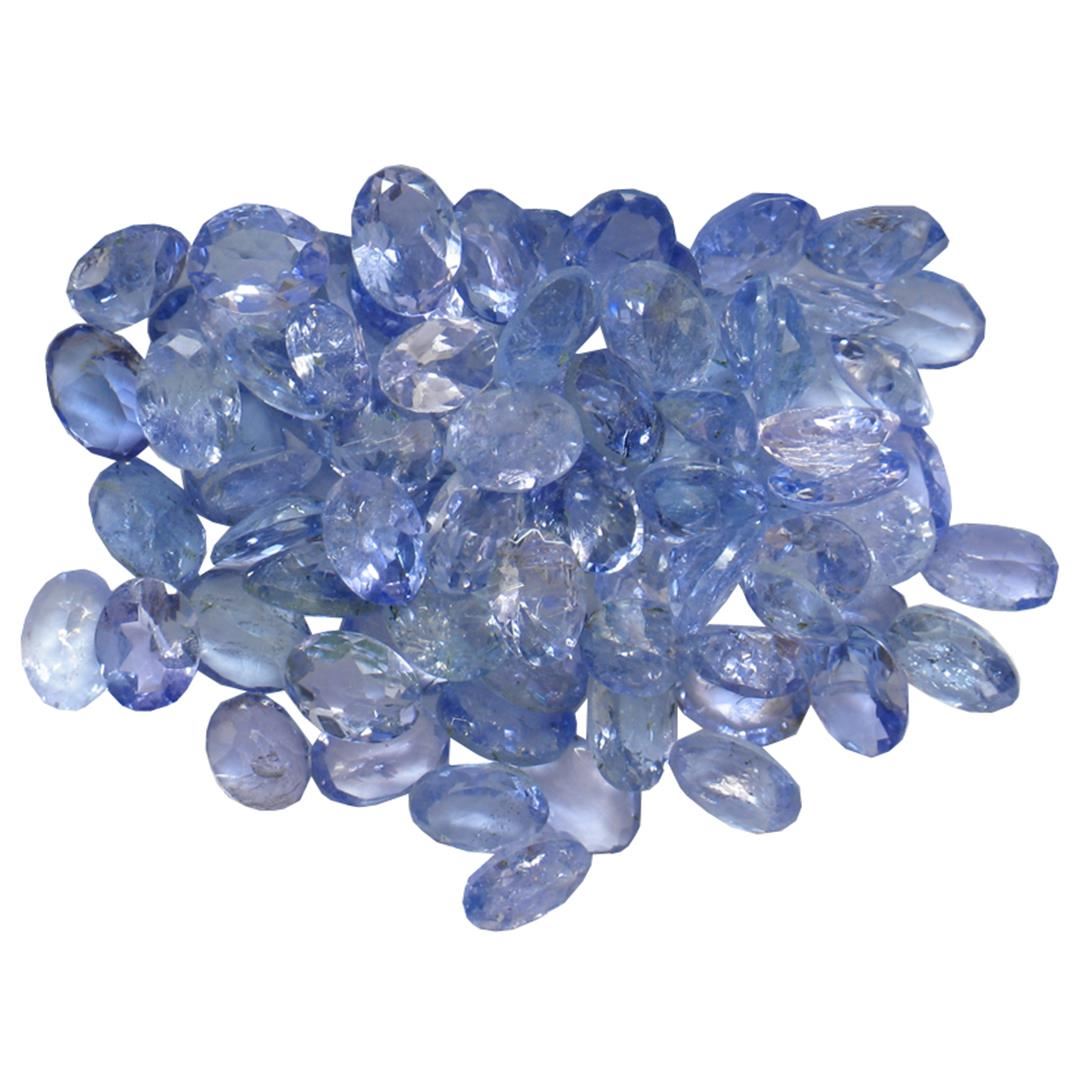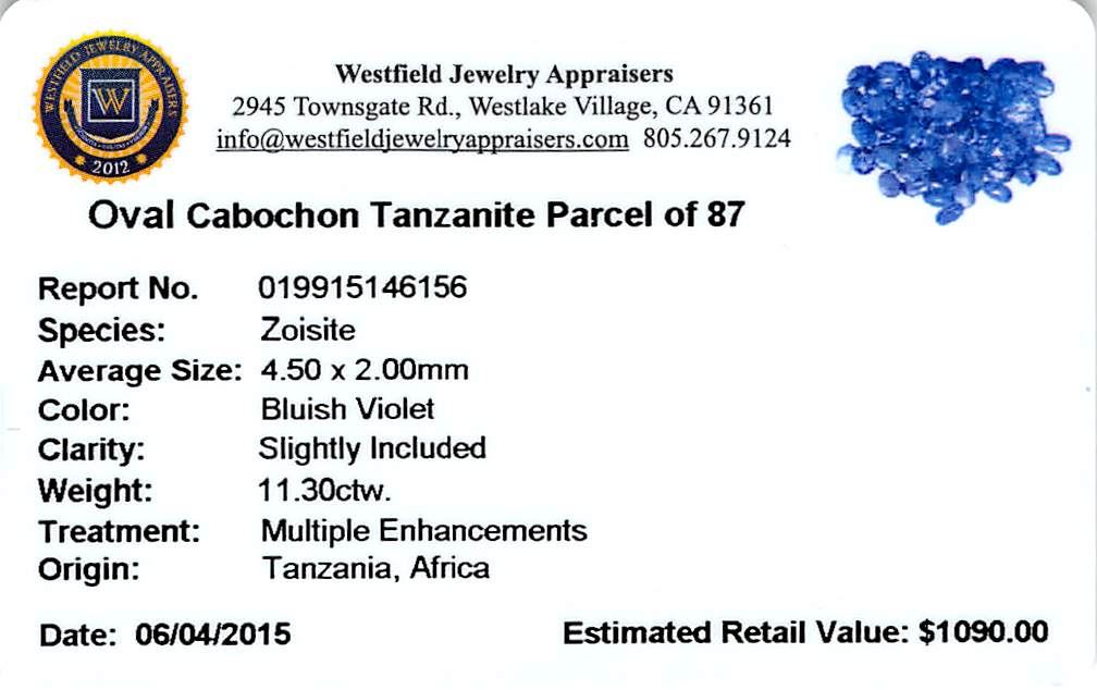 Eighty-seven oval mixed cut natural tanzanites, measuring 4.50 x 2.00 x 1.30mm, exact total weight 11.30ct., clarity is slightly included, type I, medium, very slightly grayish, bluish violet color, (GIA bV 5/3), cut is good. Transmitting light with a Westfield Appraised at $1,090.00.