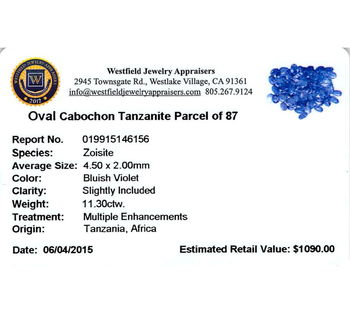Eighty-seven oval mixed cut natural tanzanites, measuring 4.50 x 2.00 x 1.30mm, exact total weight 11.30ct., clarity is slightly included, type I, medium, very slightly grayish, bluish violet color, (GIA bV 5/3), cut is good. Transmitting light with a minimum of distortion, transparent, Naturally occurring internal & external characteristics are present. Measurements & the color grade are an average for the group. Tanzanite is a very rare gemstone that is only found in the country of Tanzania. Originally discovered in 1967. Tiffany & Company, named the stone Tanzanite. It is found in the Usumburu Mountains that border the Umba Valley of northern Tanzania. Tanzanite occurs in gray, brown, violet, blue, reddish-purple, & green. The gem is interesting because of its exceptional pleochroism. Rotated in different directions a tanzanite will exhibit multiple changes of color. Tanzanite has a low tolerance to ultrasonic cleaning, and should not be cleaned using this method. Westfield Appraised at $1,090.00.