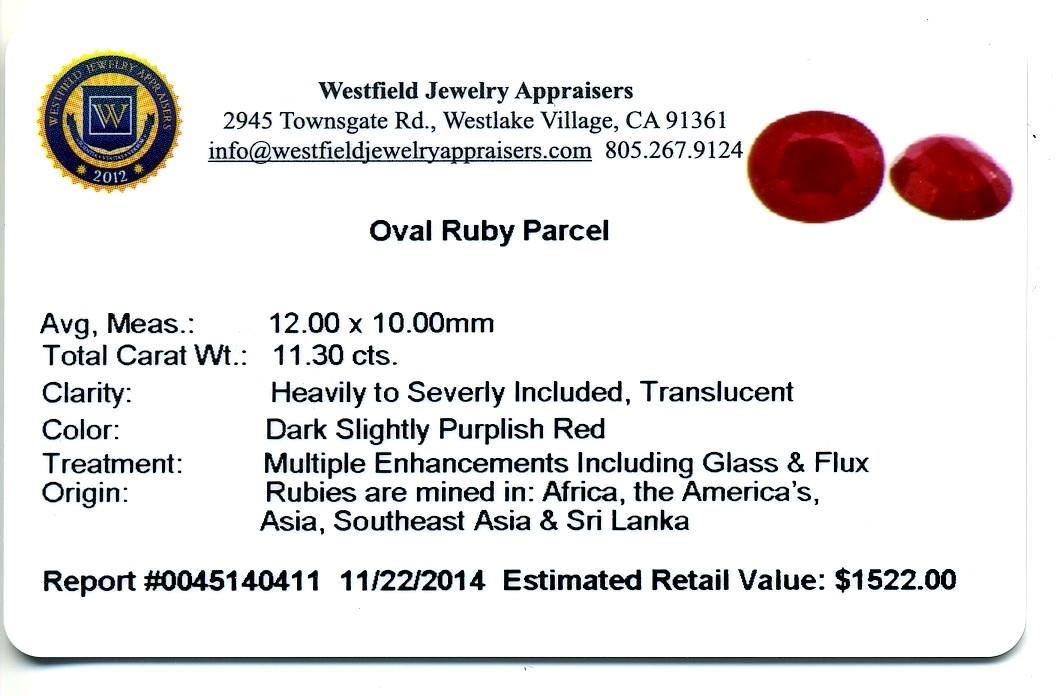 11.3ctw. Oval Ruby Parcel. Westfield Appraised at $1,522.00.