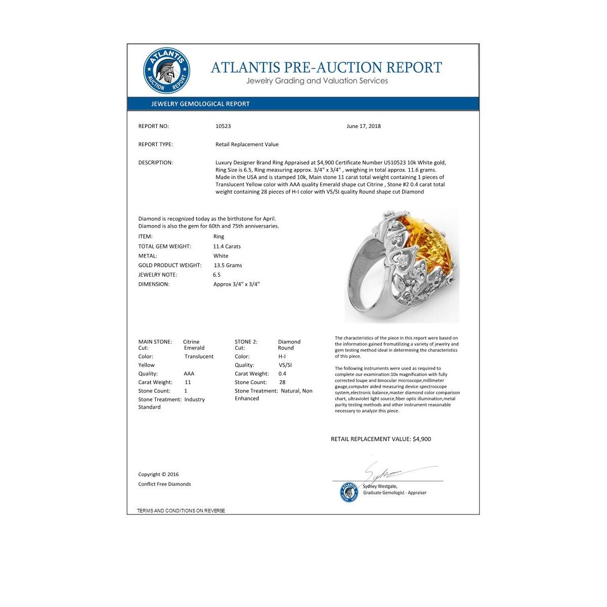 REF-80W9F -10523 ---- 11.40 CTW Citrine & Diamond Ring 10K White Gold ---- Luxury Designer Brand Ring Appraised at $4,900 Certificate Number US10523 10k White gold, Ring Size is 6.5, Ring measuring approx. 3/4" x 3/4" , weighing in total approx. 11.6 grams. Made in the USA and is stamped 10k, Main stone 11 carat total weight containing 1 pieces of Translucent Yellow color with AAA quality Emerald shape cut Citrine , Stone #2 0.4 carat total weight containing 28 pieces of H-I color with VS/SI quality Round shape cut Diamond