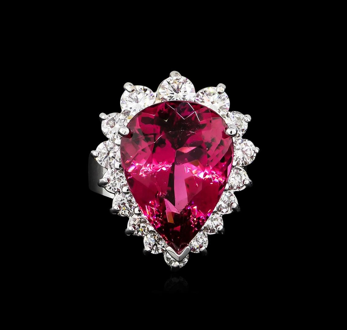 One electronically tested 14KT white gold ladies cast pink tourmaline & diamond ring with a bright finish. Identified with markings of "14K". Condition is new, good workmanship. Containing: One prong set pear mixed cut natural pink tourmaline, measuring 17.80 x 13.15 x 8.90mm, approximate weight of 11.41ct., clarity is slightly included, type II, medium, slightly brownish, strongly purplish red color, (GIA stpR 5/2), cut is good. Transmitting light with no distortion, transparent. Naturally occurring internal characteristics are present. Colored Stone Grading Report attached. Graded in the setting. Sixteen prong set round brilliant cut diamonds, measuring 4.40 - 2.60 x 2.10mm (depth est.) approximate total weight of 16 Stones = 1.99ct. Graded in the setting. Clarity: SI-2 to I-1. Color: G - I. Total Weight of Colored Stones 11.41ct. Total Weight of Diamonds 1.99ct. AIG Appraised at $20,450.00.