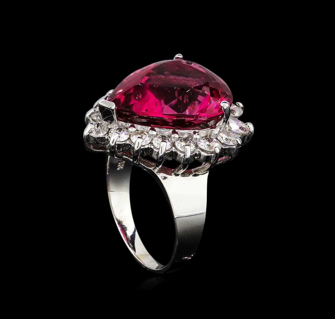 One electronically tested 14KT white gold ladies cast pink tourmaline & diamond ring with a bright finish. Identified with markings of "14K". Condition is new, good workmanship. Containing: One prong set pear mixed cut natural pink tourmaline, measuring 17.80 x 13.15 x 8.90mm, approximate weight of 11.41ct., clarity is slightly included, type II, medium, slightly brownish, strongly purplish red color, (GIA stpR 5/2), cut is good. Transmitting light with no distortion, transparent. Naturally occurring internal characteristics are present. Colored Stone Grading Report attached. Graded in the setting. Sixteen prong set round brilliant cut diamonds, measuring 4.40 - 2.60 x 2.10mm (depth est.) approximate total weight of 16 Stones = 1.99ct. Graded in the setting. Clarity: SI-2 to I-1. Color: G - I. Total Weight of Colored Stones 11.41ct. Total Weight of Diamonds 1.99ct. AIG Appraised at $20,450.00.