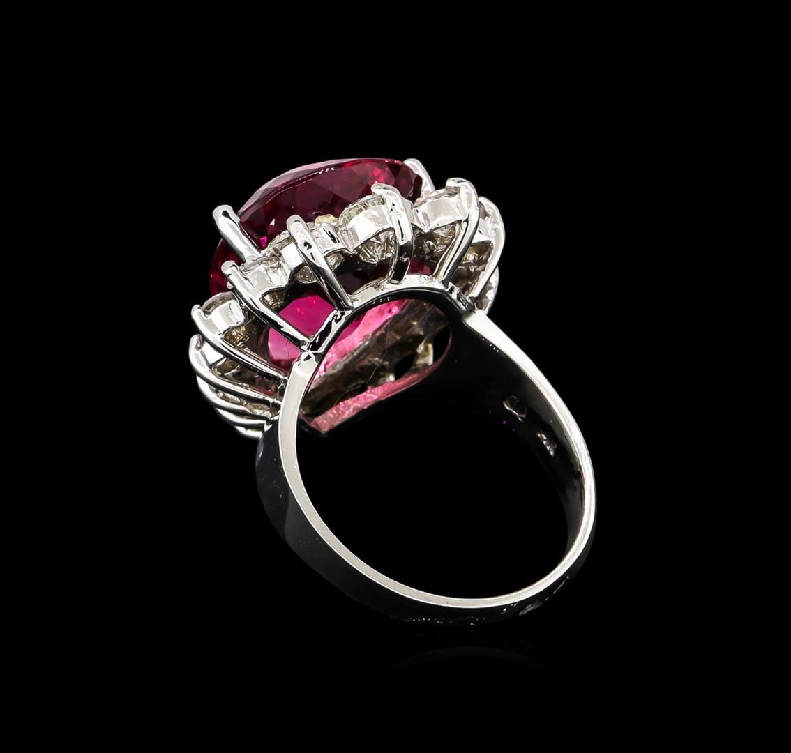 One electronically tested 14KT white gold ladies cast pink tourmaline & diamond ring with a bright finish. Identified with markings of "14K". Condition is new, good workmanship. Containing: One prong set pear mixed cut natural pink tourmaline, measuring 17.80 x 13.15 x 8.90mm, approximate weight of 11.41ct., clarity is slightly included, type II, medium, slightly brownish, strongly purplish red color, (GIA stpR 5/2), cut is good. Transmitting light with no distortion, transparent. Naturally occurring internal characteristics are present. Colored Stone Grading Report attached. Graded in the setting. Sixteen prong set round brilliant cut diamonds, measuring 4.40 - 2.60 x 2.10mm (depth est.) approximate total weight of 16 Stones = 1.99ct. Graded in the setting. Clarity: SI-2 to I-1. Color: G - I. Total Weight of Colored Stones 11.41ct. Total Weight of Diamonds 1.99ct. AIG Appraised at $20,450.00.
