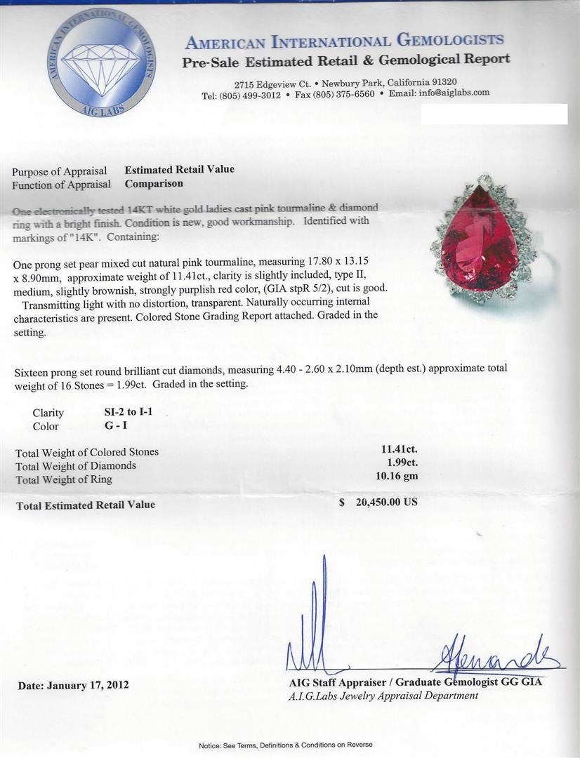 One electronically tested 14KT white gold ladies cast pink tourmaline & diamond ring with a bright finish. Identified with markings of "14K". Condition is new, good workmanship. Containing: One prong set pear mixed cut natural pink tourmaline, measuring 17.80 x 13.15 x 8.90mm, approximate weight of 11.41ct., clarity is slightly included, type II, medium, slightly brownish, strongly purplish red color, (GIA stpR 5/2), cut is good. Transmitting light with no distortion, transparent. Naturally occurring internal characteristics are present. Colored Stone Grading Report attached. Graded in the setting. Sixteen prong set round brilliant cut diamonds, measuring 4.40 - 2.60 x 2.10mm (depth est.) approximate total weight of 16 Stones = 1.99ct. Graded in the setting. Clarity: SI-2 to I-1. Color: G - I. Total Weight of Colored Stones 11.41ct. Total Weight of Diamonds 1.99ct. AIG Appraised at $20,450.00.