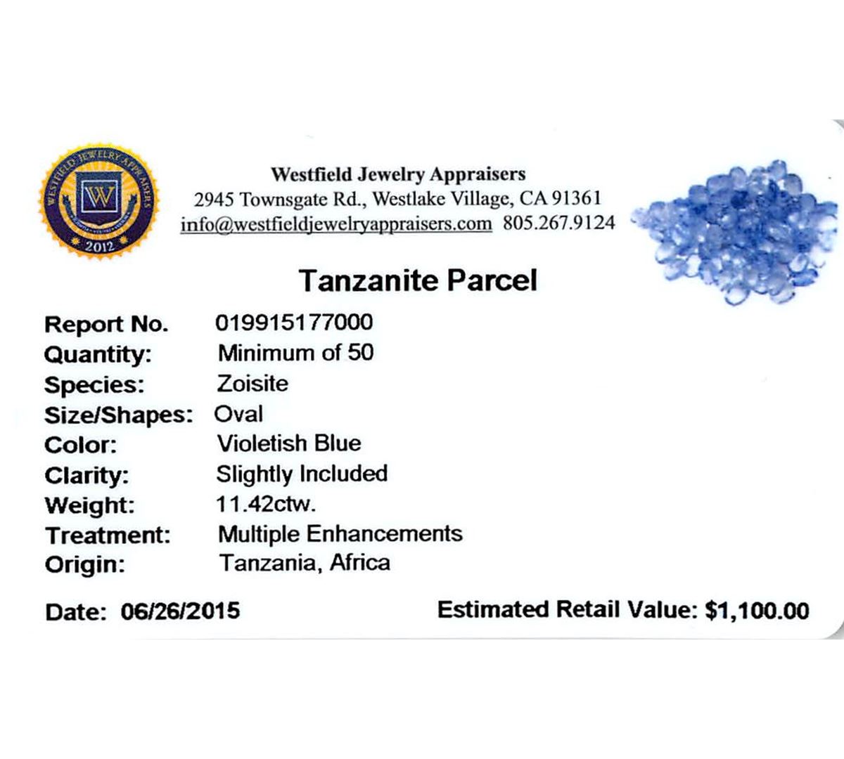 Fifty oval mixed cut natural tanzanites, measuring 4.00 x 3.00 x 1.95mm, exact total weight 11.42ct., clarity is slightly included, type I, medium, very slightly grayish, violetish blue color, (GIA vB 5/3), cut is good. Measurements & the color grade are an average for the group, Color grade is an average for the group, Transmitting light with no distortion, transparent, Naturally occurring internal & external characteristics are present, Indications of multiple laboratory enhancements, including high temperature heat treatment. Westfield Appraised at $1,100.00.