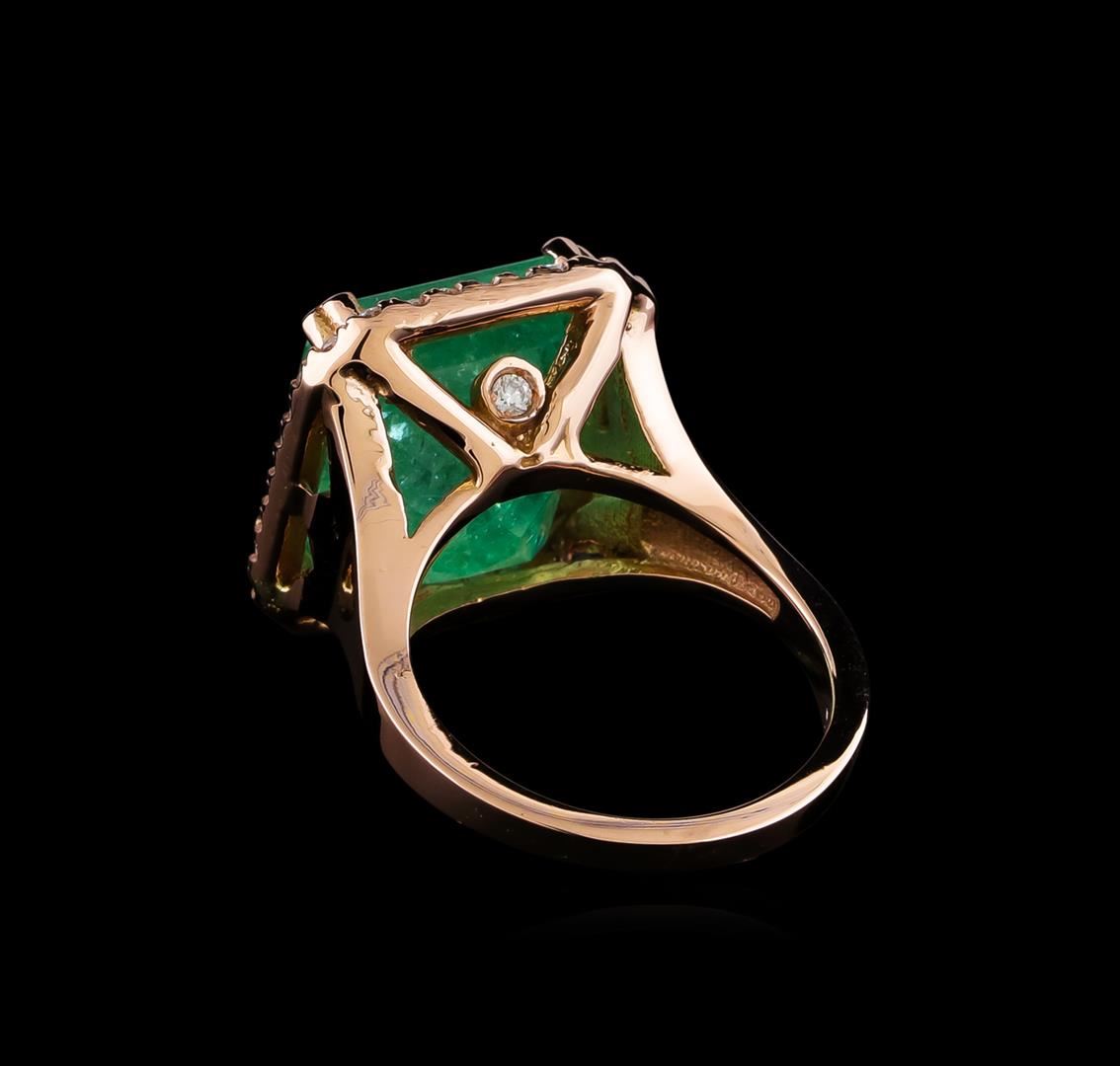 One electronically tested 14KT rose gold lady's cast fashion ring with a cathedral basket halo with a bright polish finish. The featured lady's ring has a shank measuring 2.30 millimeters in width. Identified with markings of "14K". Condition is new, good workmanship. Containing: One prong set emerald step cut natural emerald, measuring 13.58 x 12.32 x 9.89mm, (depth est.) approximate weight of 11.44ct., clarity is heavily included, medium light, moderately strong, green color, (GIA G 4/4), cut is good. Transmitting light somewhat diffusely, transparent to translucent. Colored gemstones are presumed to have been subjected to commonly used enhancement processes. Indications of oil residue. Graded in the setting. Two bezel set round brilliant cut diamonds, measuring 1.90 - 1.85 x 1.16mm (depth est.) approximate total weight of 2 Stones = 0.05ct. Graded in the setting. Clarity: SI-1. Color: Very Good Thirty-Four prong set round brilliant cut diamonds, measuring 1.65 - 1.60 x 1.01mm (depth est.) approximate total weight of 34 Stones = 0.52ct. Graded in the setting. Clarity: SI-1 to SI-2. Color: H - I. Cut Good. Total Weight of Colored Stones 11.44ct. Total Weight of Diamonds 0.57ct. Total Weight of Ring 10.30gm. GAS Appraised at $21,580.00.
