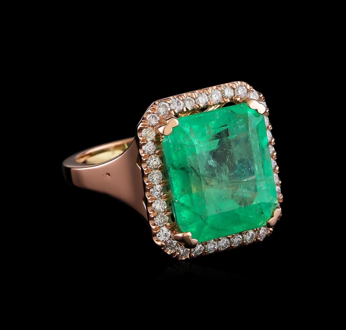 One electronically tested 14KT rose gold lady's cast fashion ring with a cathedral basket halo with a bright polish finish. The featured lady's ring has a shank measuring 2.30 millimeters in width. Identified with markings of "14K". Condition is new, good workmanship. Containing: One prong set emerald step cut natural emerald, measuring 13.58 x 12.32 x 9.89mm, (depth est.) approximate weight of 11.44ct., clarity is heavily included, medium light, moderately strong, green color, (GIA G 4/4), cut is good. Transmitting light somewhat diffusely, transparent to translucent. Colored gemstones are presumed to have been subjected to commonly used enhancement processes. Indications of oil residue. Graded in the setting. Two bezel set round brilliant cut diamonds, measuring 1.90 - 1.85 x 1.16mm (depth est.) approximate total weight of 2 Stones = 0.05ct. Graded in the setting. Clarity: SI-1. Color: Very Good Thirty-Four prong set round brilliant cut diamonds, measuring 1.65 - 1.60 x 1.01mm (depth est.) approximate total weight of 34 Stones = 0.52ct. Graded in the setting. Clarity: SI-1 to SI-2. Color: H - I. Cut Good. Total Weight of Colored Stones 11.44ct. Total Weight of Diamonds 0.57ct. Total Weight of Ring 10.30gm. GAS Appraised at $21,580.00.