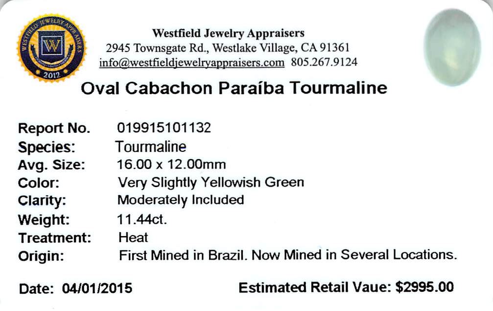 One oval cabochon cut natural Paraiba tourmaline exact weight 11.44ct., clarity is moderately included, cut is good. Westfield Appraised at $2,995.00.
