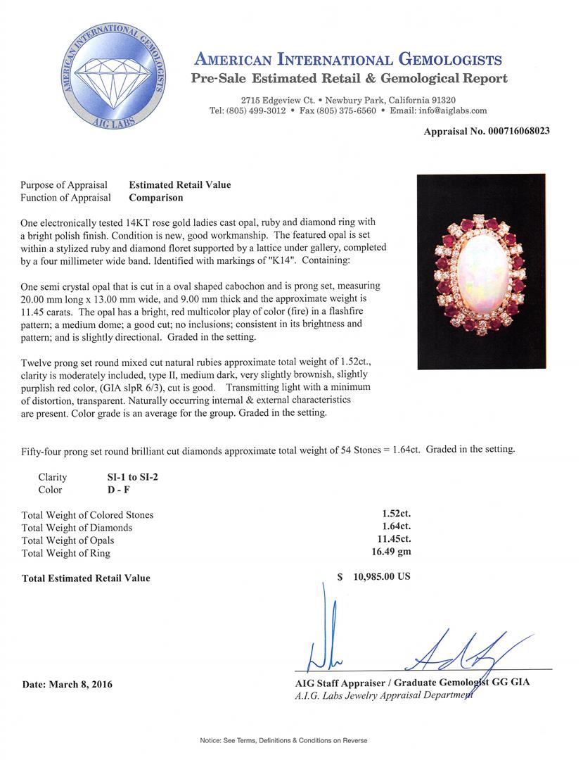 One electronically tested 14KT rose gold ladies cast opal, ruby and diamond ring with a bright polish finish. The featured opal is set within a stylized ruby and diamond floret supported by a lattice under gallery, completed by a four millimeter wide band. Identified with markings of "K14". Condition is new, good workmanship. Containing: One semi crystal opal that is cut in a oval shaped cabochon and is prong set, measuring 20.00 mm long x 13.00 mm wide, and 9.00 mm thick and the approximate weight is 11.45 carats. The opal has a bright, red multicolor play of color (fire) in a flashfire pattern; a medium dome; a good cut; no inclusions; consistent in its brightness and pattern; and is slightly directional. Graded in the setting. Twelve prong set round mixed cut natural rubies approximate total weight of 1.52ct., clarity is moderately included, type II, medium dark, very slightly brownish, slightly purplish red color, (GIA slpR 6/3), cut is good. Transmitting light with a minimum of distortion, transparent. Naturally occurring internal & external characteristics are present. Color grade is an average for the group. Graded in the setting. Fifty-Four prong set round brilliant cut diamonds approximate total weight of 54 Stones = 1.64ct. Graded in the setting. Clarity: SI-1 to SI-2. Color: D - F. Total Weight of Colored Stones 1.52ct. Total Weight of Diamonds 1.64ct. Total Weight of Opals 11.45ct. Total Weight of Ring 16.49gm. AIG Appraised at $10,985.00.