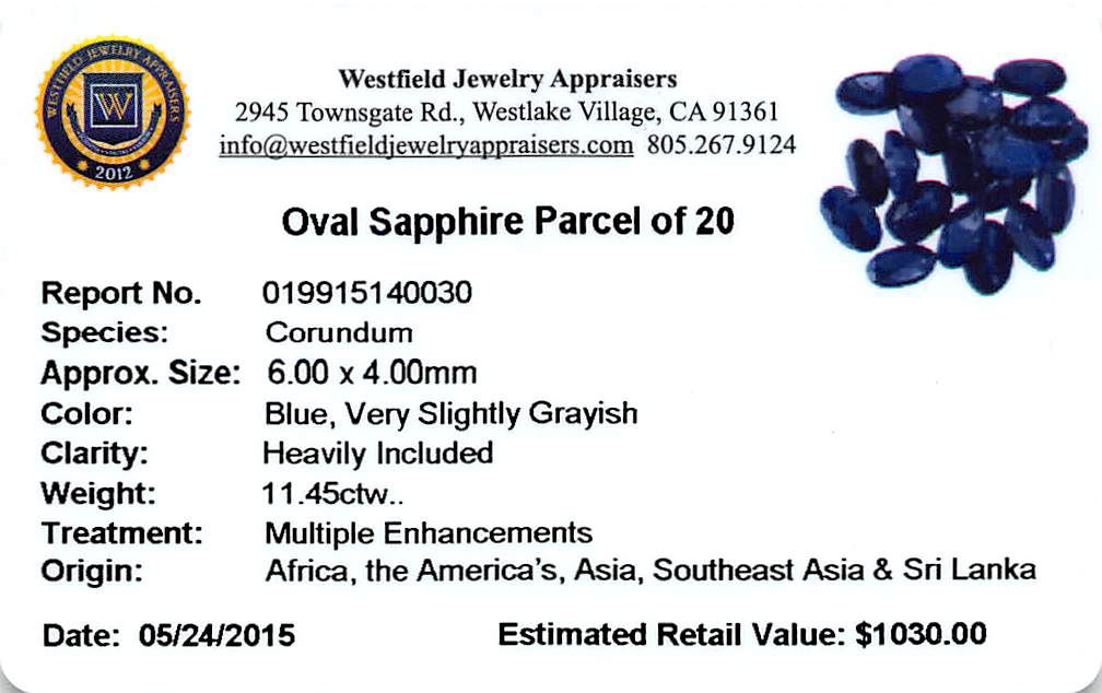 Twenty oval mixed cut natural blue sapphires, measuring 6.00 x 4.00 x 0.00mm, exact total weight 11.45ct., clarity is heavily included, type II, dark, very slightly grayish, blue color, (GIA B 7/3), cut is good. Indications of multiple laboratory enhancements, including high temperature heat treatment. Westfield Appraised at $1,030.00.