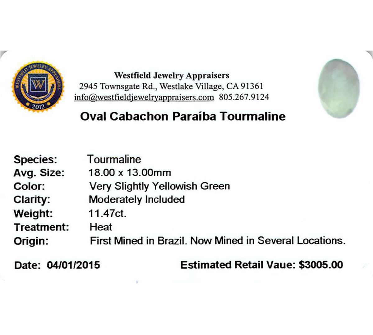 One oval cabochon cut natural Paraiba tourmaline exact weight 11.47ct., clarity is moderately included, cut is good. Westfield Appraised at $3,005.00.