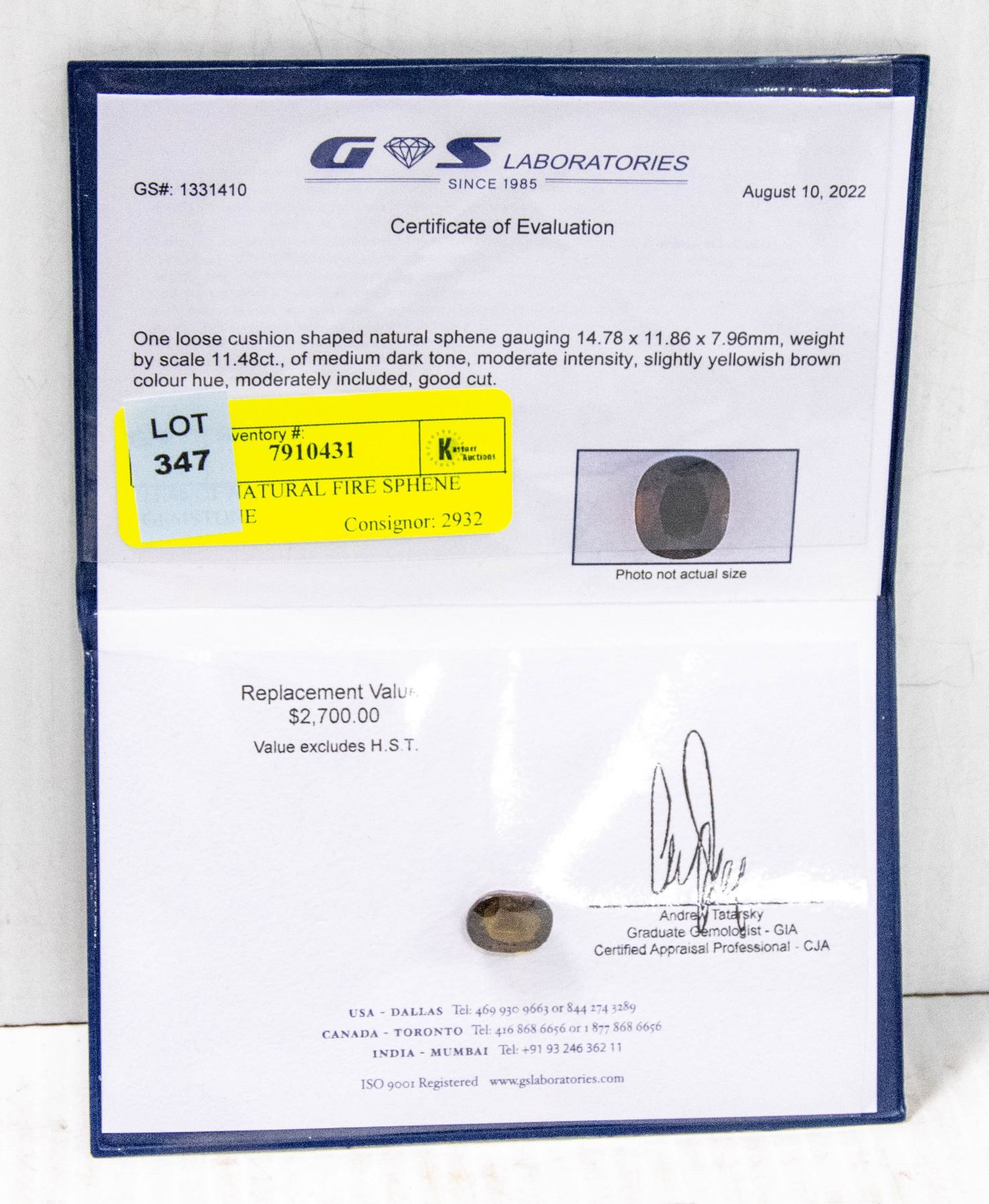 11.48 CT NATURAL SPHENE APPRAISAL FROM GEMSCAN (GS LABS) IN DOWNTOWN TORONTO. 14.78 X 11.86 X 7.96MM TREATMENT: NONE. CLARITY: VS ORIGIN: AFRICA. FROM A GEMOLOGIST COLLECTION. $2700 APPRAISAL CUSHION CUT - INCLUDES APPRAISAL CERTIFICATE **ALL ITEMS MUST BE REMOVED BY 5PM SATURDAY, JULY 15TH 2023. ALL REMAINING ITEMS WILL BE SUBJECT TO A $6.00 PER DAY STORAGE CHARGE. ANY ITEMS REMAINING AFTER MONDAY, JULY 31ST, 2023 WILL BE CONSIDERED FORFEITED. NO REFUNDS WILL BE ISSUED FOR FORFEITED ITEMS. TO SCHEDULE A PICK UP APPOINTMENT CLICK HERE